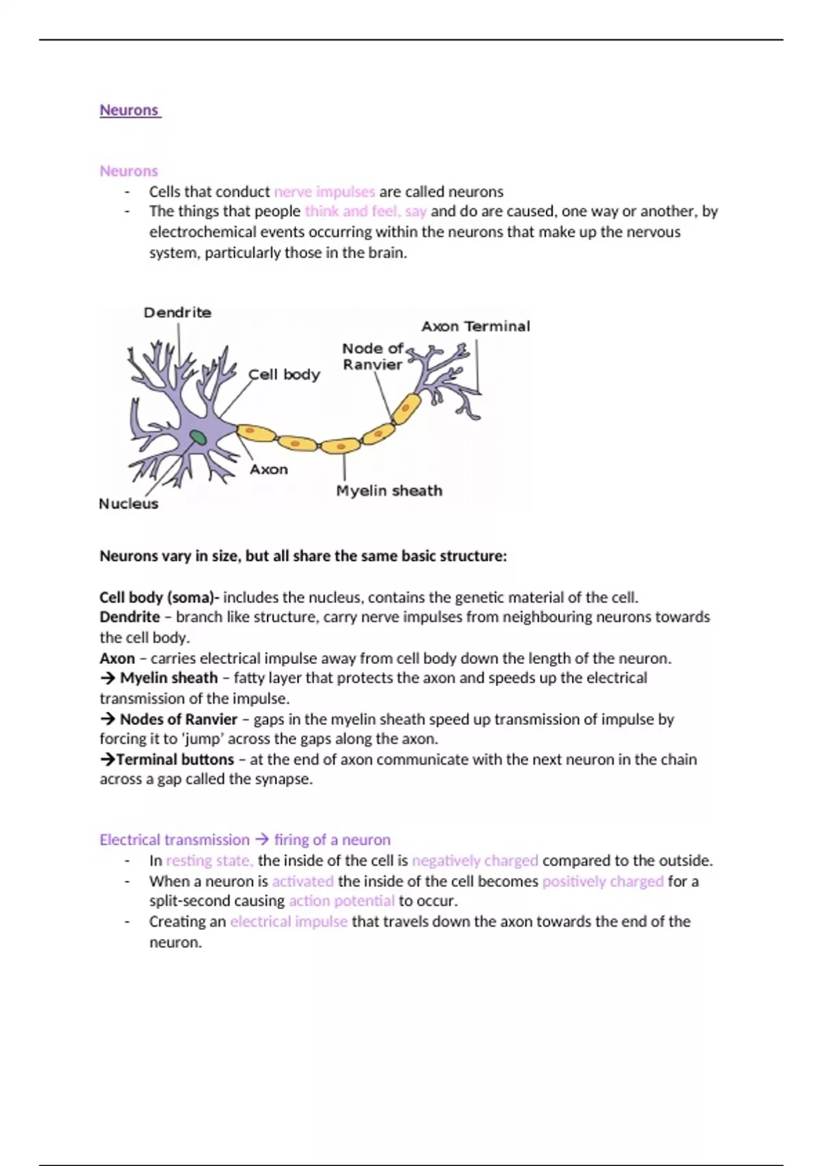 Cell body (soma)- includes the nucleus, contains the genetic material of the cell.