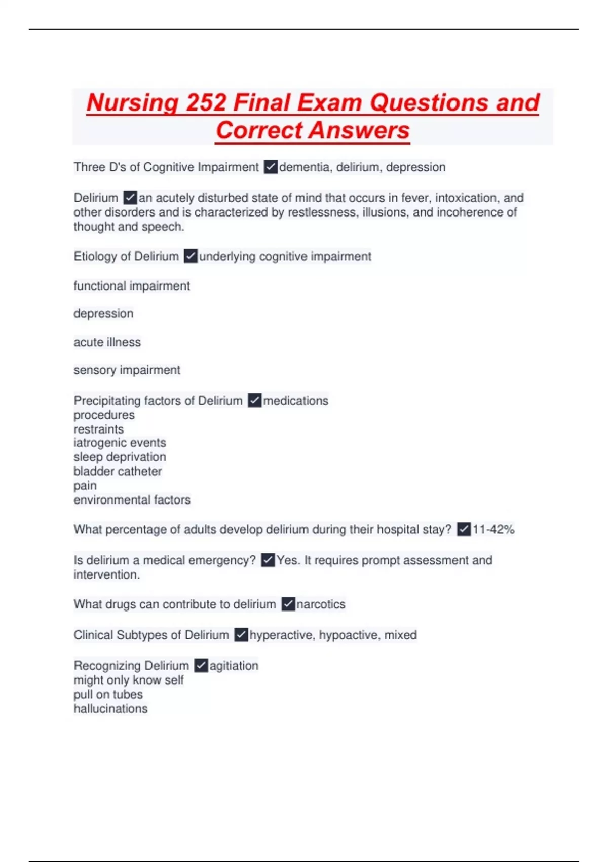 Three D's of Cognitive Impairment dementia, delirium, depression Delirium an acutely disturbed state of mind that occurs in fever, intoxication, and other disorders and is characterized by restlessness, illusions, and incoherence of thought and speech. Etiology of Delirium underlying cognitive impairment functional impairment depression acute illness sensory impairment Precipitating factors of Delirium medications procedures restraints iatrogenic events sleep deprivation bladder catheter pain environmental factors What percentage of adults develop delirium during their hospital stay? 11-42% Is delirium a medical emergency? Yes. It requires prompt assessment and intervention. What drugs can contribute to delirium narcotics Clinical Subtypes of Delirium hyperactive, hypoactive, mixed Recognizing Delirium agitiation might only know self pull on tubes hallucinations
