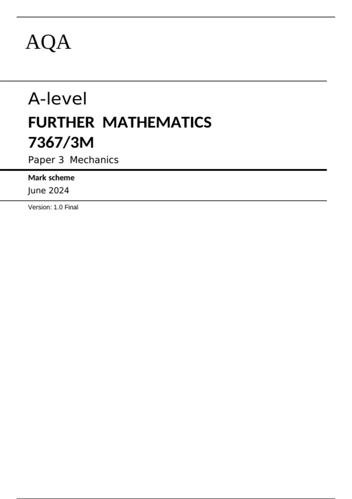AQA A-level FURTHER MATHEMATICS 7367/3M Paper 3 Mechanics Mark scheme June 2024