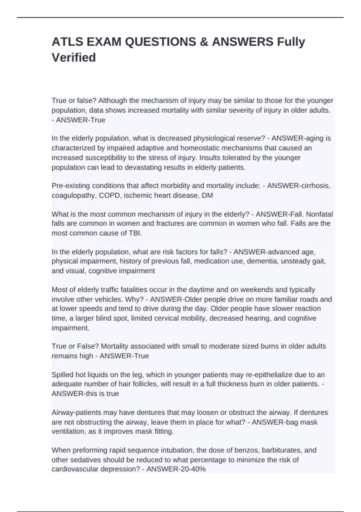 True or false? Although the mechanism of injury may be similar to those for the younger population, data shows increased mortality with similar severity of injury in older adults. - ANSWER-True In the elderly population, what is decreased physiological reserve? - ANSWER-aging is characterized by impaired adaptive and homeostatic mechanisms that caused an increased susceptibility to the stress of injury. Insults tolerated by the younger population can lead to devastating results in elderly patients. Pre-existing conditions that affect morbidity and mortality include: - ANSWER-cirrhosis, coagulopathy, COPD, ischemic heart disease, DM What is the most common mechanism of injury in the elderly? - ANSWER-Fall. Nonfatal falls are common in women and fractures are common in women who fall. Falls are the most common cause of TBI. In the elderly population, what are risk factors for falls? - ANSWER-advanced age, physical impairment, history of previous fall, medication use, dementia, unsteady gait, and visual, cognitive impairment Most of elderly traffic fatalities occur in the daytime and on weekends and typically involve other vehicles. Why? - ANSWER-Older people drive on more familiar roads and at lower speeds and tend to drive during the day. Older people have slower reaction time, a larger blind spot, limited cervical mobility, decreased hearing, and cognitive impairment. True or False? Mortality associated with small to moderate sized burns in older adults remains high - ANSWER-True Spilled hot liquids on the leg, which in younger patients may re-epithelialize due to an adequate number of hair follicles, will result in a full thickness burn in older patients. - ANSWER-this is true Airway-patients may have dentures that may loosen or obstruct the airway. If dentures are not obstructing the airway, leave them in place for what? - ANSWER-bag mask ventilation, as it improves mask fitting. When preforming rapid sequence intubation, the dose of benzos, barbiturates, and other sedatives should be reduced to what percentage to minimize the risk of cardiovascular depression? - ANSWER-20-40% Functional changes in cardiac system include declining function, decreased sensitivity to catecholamines, atherosclerosis of coronary vessels, increased afterload, fixed heart rate (beta blockers) - ANSWER-this results in lack of classic response to hypovolemia, risk for cardiac ischemia, elevated BP at baseline, and increased risk of dysrythmias. Functional changes in pulmonary system include decreased elastic recoil, reduced residual capacity, decreased gas exchange and decreased cough reflex - ANSWER-thus they are at increased risk for respiratory failure, increased risk for pneumonia, and poor tolerance to rib fractures Functional changes in renal system include loss of renal mass, decreased GFR, and decreased sensitivity to ADH and aldosterone - ANSWER-resulting in drug dosing for renal insufficiency, decreased ability to concentrate urine, increased risk for AKI and urine flow may be normal with hypovolemia Functional changes to MSK include loss of lean body mass, osteoporosis, changes in joints and cartilage, c spine degenerative changes and loss of skin elastin and subcutaneous fat - ANSWER-resulting in increased risk for fractures, decreased mobility, difficulty for oral intubation, risk of skin injury, increased risk for hypothermia, challenges in rehabiliation Functional changes in Endocrine system include decreased production and response to thyroxin and decreased dehydroepiandrosterone (DHEA) - ANSWER-resulting in occult hypothyroidism, relative hypercortisone states and increased risk of infection True or false: Arthritis can complicate the airway and cervical spine. Patients can have multilevel degenerative changes affecting disk spaces and posterior elements associated with severe central canal stenosis, cord compression, and myelomalacia - ANSWER-true In elderly population, due to their changes in pulmonary system, placing a gauze between gums and cheek to achieve seal when using bag valve mask ventilation is okay. In addition, because aging causes a suppressed heart rate response to hypoxia...... - ANSWER-respiratory failure may present insidiously in older adults. Age related changes in the cardiovascular system place the elderly trauma patient at significant risk for being inaccurately categorized as hemodynamically stable. - ANSWER-Elderly patients have a fixed heart rate and fixed cardiac output, thus, their response to hypovolemia will involve increasing their systemic vascular resistance. Furthermore, since older patients have HTN, an acceptable BP may truly reflect a hypotensive state. A systolic BP of 110 is to be utilized as the threshold for identifying hypotension in patients 65 and older.