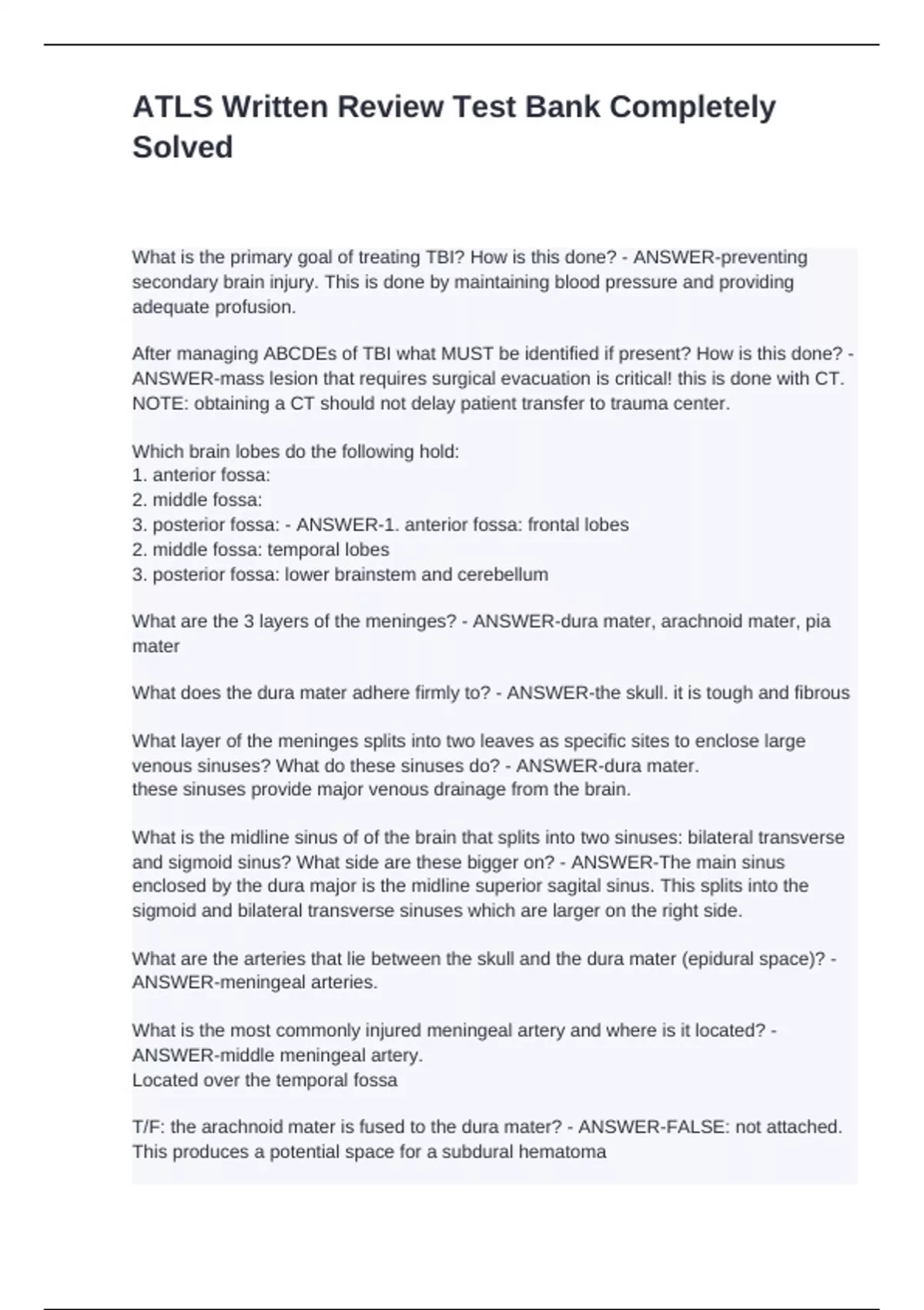 What is the primary goal of treating TBI? How is this done? - ANSWER-preventing secondary brain injury. This is done by maintaining blood pressure and providing adequate profusion. After managing ABCDEs of TBI what MUST be identified if present? How is this done? - ANSWER-mass lesion that requires surgical evacuation is critical! this is done with CT. NOTE: obtaining a CT should not delay patient transfer to trauma center. Which brain lobes do the following hold: 1. anterior fossa: 2. middle fossa: 3. posterior fossa: - ANSWER-1. anterior fossa: frontal lobes 2. middle fossa: temporal lobes 3. posterior fossa: lower brainstem and cerebellum What are the 3 layers of the meninges? - ANSWER-dura mater, arachnoid mater, pia mater What does the dura mater adhere firmly to? - ANSWER-the skull. it is tough and fibrous What layer of the meninges splits into two leaves as specific sites to enclose large venous sinuses? What do these sinuses do? - ANSWER-dura mater. these sinuses provide major venous drainage from the brain. What is the midline sinus of of the brain that splits into two sinuses: bilateral transverse and sigmoid sinus? What side are these bigger on? - ANSWER-The main sinus enclosed by the dura major is the midline superior sagital sinus. This splits into the sigmoid and bilateral transverse sinuses which are larger on the right side. What are the arteries that lie between the skull and the dura mater (epidural space)? - ANSWER-meningeal arteries. What is the most commonly injured meningeal artery and where is it located? - ANSWER-middle meningeal artery. Located over the temporal fossa T/F: the arachnoid mater is fused to the dura mater? - ANSWER-FALSE: not attached. This produces a potential space for a subdural hematoma In a subdural hematoma, what is the cause? - ANSWER-injury to bridging veins that extend from brain surface to the sinuses within the dura. _______ fills the space between the arachnoid and pia mater? - ANSWER-CSF. this cushions the brain and spinal cord. What location of brain hemorrhage is frequently seen in brain contusion or injury to major blood vessels at base of brain? - ANSWER-subarachnoid. The ____ and _____ contain the reticular activating system which is responsible for ____. - ANSWER-midbrain and upper pons state of alertness What important function resides in the medulla? - ANSWER-cardiorespiratory centers. What important functions are in the following brain segments: 1. left hemisphere: 2. frontal lobe: 3. parietal lobe: 4. temporal: - ANSWER-1. left hemisphere: language center 2. frontal lobe: executive function, emotions, motor 3. parietal lobe: sensory function/spatial orientation 4. temporal: memory functions What divides the brain into supratentorial and infratentorial compartments? - ANSWER-tentorium cerebelli. (tent over cerebellum) What is the physiology behind a blown pupil? - ANSWER-blown pupil: dilation of pupil -CN III runs along the tentorium cerebelli. parasympathetic fibers that constrict the pupil run along CN III (oculomotor). When temporal lobe is herniated, it can compress these fibers. Unapposed sympathetic activity causes pupillary dilation. What is the tentorial notch/hiatus - ANSWER-this is where the midbrain passes through into the infratentorial compartment. what part of the brain most commonly herniates through the tentorial notch? - ANSWER-Uncus (medial part of temporal lobe) does weakness occur on the same or opposite side of the uncal herniation? - ANSWER-OPPOSITE. the corticospinal tract of the midbrain is compressed and then crosses at the foramen magnum. state: Ipsilateral/contralateral ____ pupillary dilation associated with _____ hemiparesis is the classic sign of uncial herniation. - ANSWER-ipsi