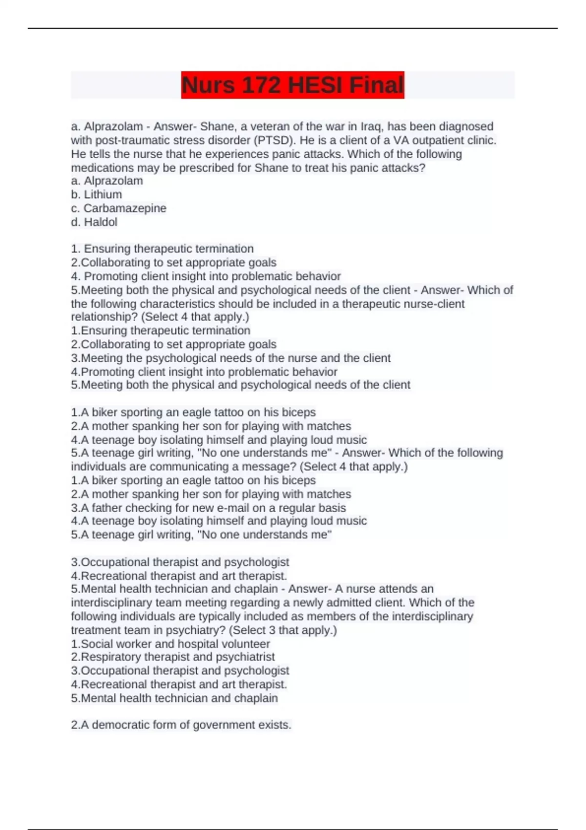 Nurs 172 HESI Final a. Alprazolam - Answer- Shane, a veteran of the war in Iraq, has been diagnosed with post-traumatic stress disorder (PTSD). He is a client of a VA outpatient clinic. He tells the nurse that he experiences panic attacks. Which of the following medications may be prescribed for Shane to treat his panic attacks? a. Alprazolam b. Lithium c. Carbamazepine d. Haldol 1. Ensuring therapeutic termination 2.Collaborating to set appropriate goals 4. Promoting client insight into problematic behavior 5.Meeting both the physical and psychological needs of the client - Answer- Which of the following characteristics should be included in a therapeutic nurse-client relationship? (Select 4 that apply.) 1.Ensuring therapeutic termination 2.Collaborating to set appropriate goals 3.Meeting the psychological needs of the nurse and the client 4.Promoting client insight into problematic behavior 5.Meeting both the physical and psychological needs of the client 1.A biker sporting an eagle tattoo on his biceps 2.A mother spanking her son for playing with matches 4.A teenage boy isolating himself and playing loud music 5.A teenage girl writing, "No one understands me" - Answer- Which of the following individuals are communicating a message? (Select 4 that apply.) 1.A biker sporting an eagle tattoo on his biceps 2.A mother spanking her son for playing with matches 3.A father checking for new e-mail on a regular basis 4.A teenage boy isolating himself and playing loud music 5.A teenage girl writing, "No one understands me" 3.Occupational therapist and psychologist 4.Recreational therapist and art therapist. 5.Mental health technician and chaplain - Answer- A nurse attends an interdisciplinary team meeting regarding a newly admitted client. Which of the following individuals are typically included as members of the interdisciplinary treatment team in psychiatry? (Select 3 that apply.) 1.Social worker and hospital volunteer 2.Respiratory therapist and psychiatrist 3.Occupational therapist and psychologist 4.Recreational therapist and art therapist. 5.Mental health technician and chaplain 2.A democratic form of government exists.