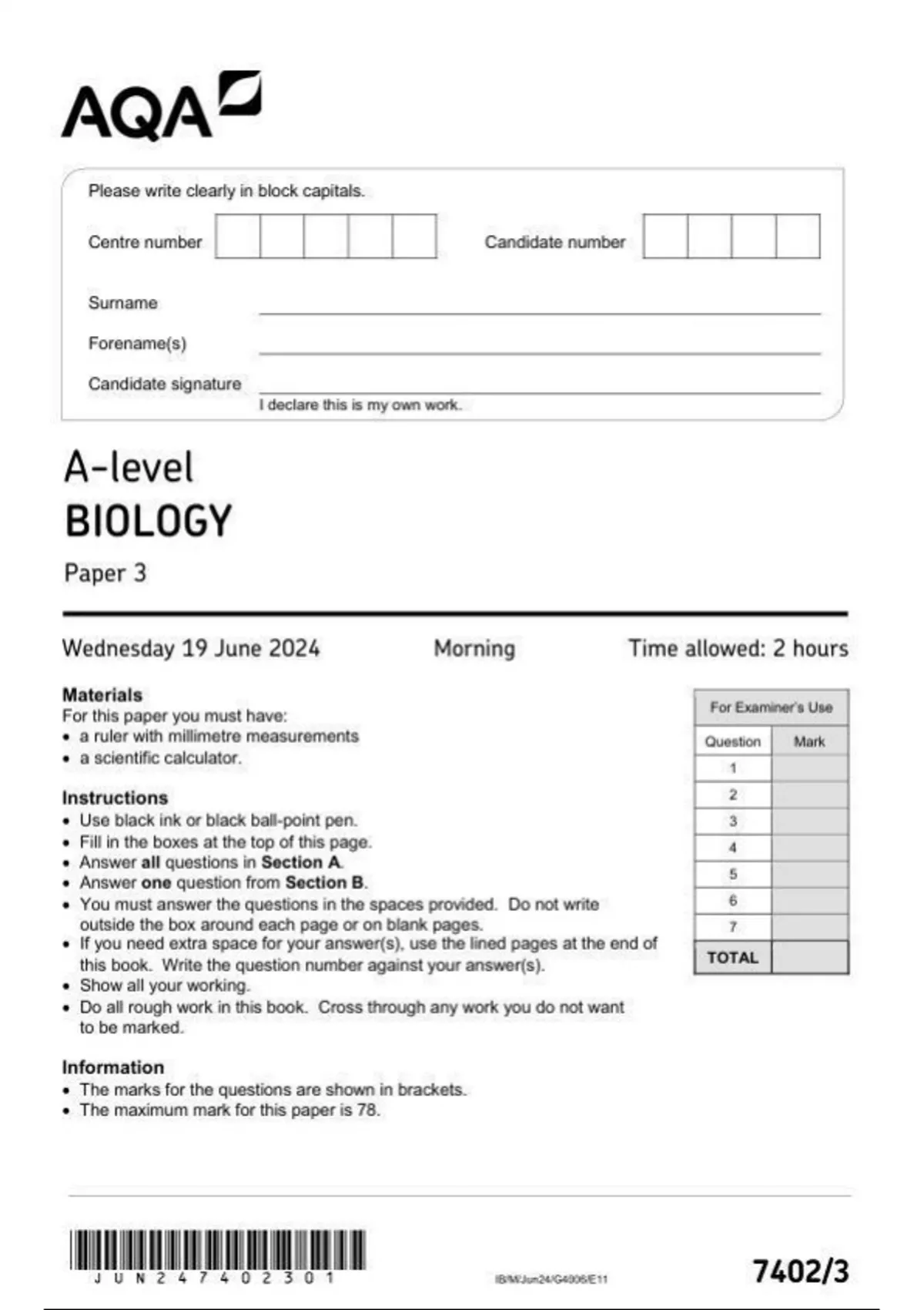 AQA A LEVEL BIOLOGY PAPER 3 JUNE 2024 FINAL QUESTION PAPER