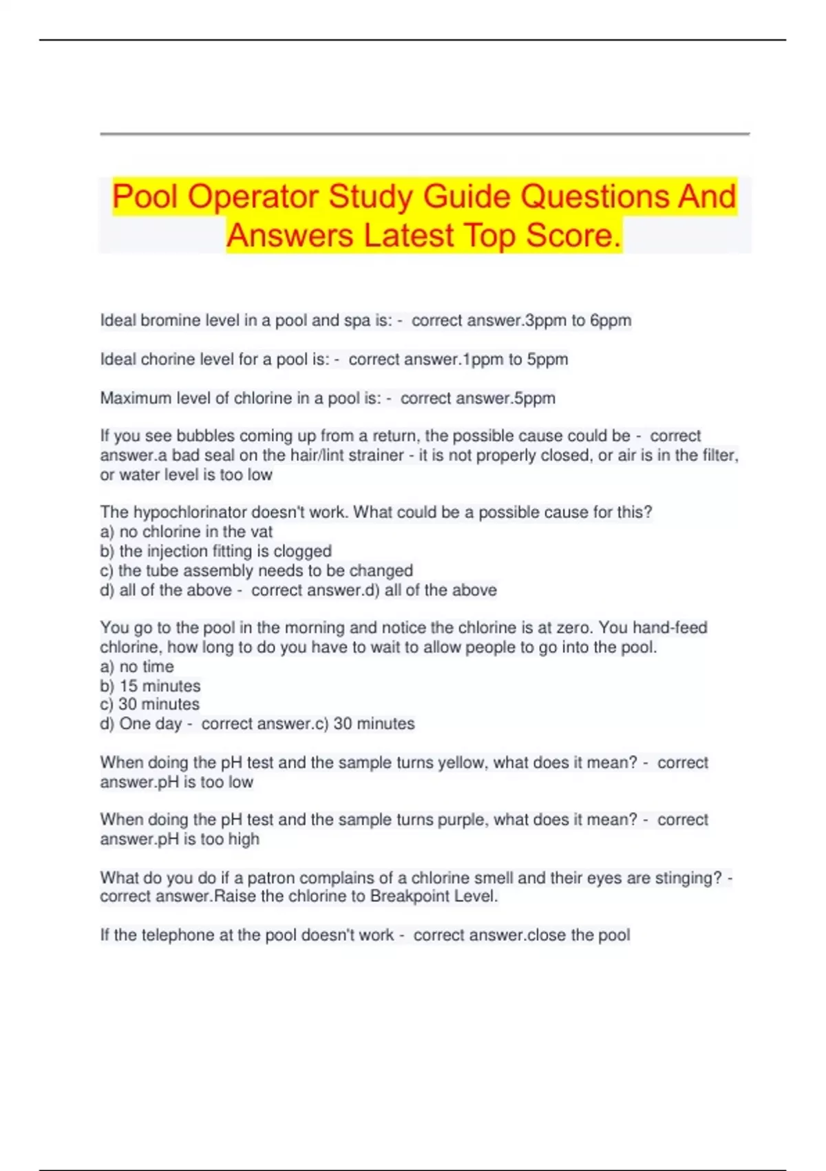 Pool Operator Study Guide Questions And Answers Latest Top Score. Ideal bromine level in a pool and spa is: - correct answer.3ppm to 6ppm Ideal chorine level for a pool is: - correct answer.1ppm to 5ppm Maximum level of chlorine in a pool is: - correct answer.5ppm If you see bubbles coming up from a return, the possible cause could be - correct answer.a bad seal on the hair/lint strainer - it is not properly closed, or air is in the filter, or water level is too low The hypochlorinator doesn't work. What could be a possible cause for this? a) no chlorine in the vat b) the injection fitting is clogged c) the tube assembly needs to be changed d) all of the above - correct answer.d) all of the above You go to the pool in the morning and notice the chlorine is at zero. You hand-feed chlorine, how long to do you have to wait to allow people to go into the pool. a) no time b) 15 minutes c) 30 minutes d) One day - correct answer.c) 30 minutes When doing the pH test and the sample turns yellow, what does it mean? - correct answer.pH is too low When doing the pH test and the sample turns purple, what does it mean? - correct answer.pH is too high What do you do if a patron complains of a chlorine smell and their eyes are stinging? - correct answer.Raise the chlorine to Breakpoint Level. If the telephone at the pool doesn't work - correct the pool What should you use when handling chemicals? - correct answer.Personal Protective Equipment - Gloves, Goggles, Apron What happens if the alkalinity level is too low? - correct answer.pH is difficult to maintain, the water will cause damage to the pool walls ADD CHEMICALS TO WATER; DO NOT ADD WATER TO CHEMICALS - correct answer.... How do you lower the Calcium Hardness Level? - correct answer.Drain water out and add fresh water. Dilute the water. What should you have if the water is deeper than 5 ft? - correct answer.Put up a safety line If the chlorinator is working and you have chlorine in the vat, what is a possible reason for the chlorine reading being 0? - correct answer.The test could be bleached (chlorine level is too high) What kind of filter media filters the smallest particles? - correct answer.Diatomaceous Earth (DE) To be a pool operator you must - correct ete pool operators training course The strongest suction in the pool is - correct main drain Electrical system at pool must have - correct answer.GFI's The skimmer - correct prevents floating material from re-entering the pool. Filtration is the - correct cal process of water moving through the system. The time it takes for all the water to go through the filter system is the - correct ver rate In most jurisdictions the turnover rate is - correct answer.6 hours Algae forms because of - correct circulation and/or low chlorine levels Most common form of algae - correct Worst type of algae - correct What is responsible for stains in the pool? - correct r, iron, magnesium and other metals