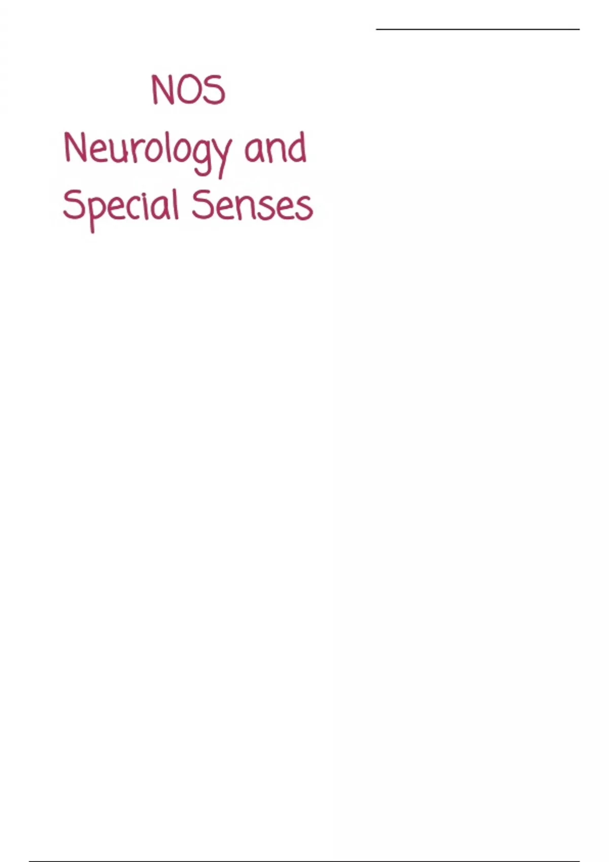 In-depth notes of the neurology and special senses (NOS) module from RVC BvetMed2 course in 2023/24. This includes diagrams and photos annotated to indicate processes. Colour coding, highlighting, and mindmaps are used to highlight specific words or definitions. Each page is titled with a number code corresponding to the lecture Lectures included; Neurons and Neuroglia Action Potentials Synapses Cranial Nerves Neural tube development Autonomic control The Meninges The Eye The Ear Lower and Upper motor neurons Motor/sensory pathways