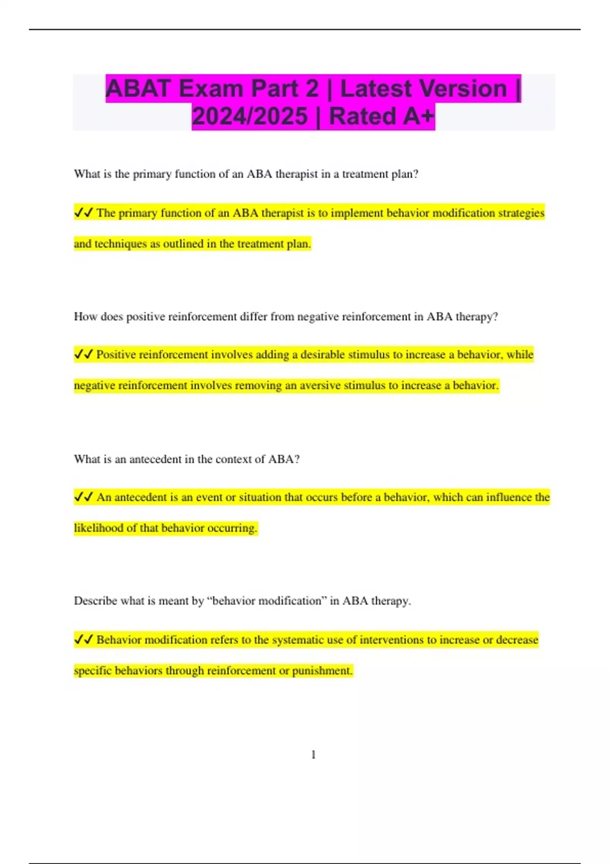ABAT Exam Part 2 | Latest Version | 2024/2025 | Rated A+ What is the primary function of an ABA therapist in a treatment plan? The primary function of an ABA therapist is to implement behavior modification strategies and techniques as outlined in the treatment plan. How does positive reinforcement differ from negative reinforcement in ABA therapy? Positive reinforcement involves adding a desirable stimulus to increase a behavior, while negative reinforcement involves removing an aversive stimulus to increase a behavior. What is an antecedent in the context of ABA? An antecedent is an event or situation that occurs before a behavior, which can influence the likelihood of that behavior occurring. Describe what is meant by “behavior modification” in ABA therapy. Behavior modification refers to the systematic use of interventions to increase or decrease specific behaviors through reinforcement or punishment. 2 What role does data collection play in ABA therapy? Data collection is essential in ABA therapy as it provides objective evidence of a client’s progress and helps in making informed decisions about treatment adjustments. What is a functional behavior assessment (FBA)? A functional behavior assessment (FBA) is a process used to identify the causes and functions of challenging behaviors to develop effective intervention strategies. Explain the term “discrete trial training” in ABA therapy. Discrete trial training is a structured teaching method in ABA where skills are broken down into small, manageable tasks and taught through repeated trials and reinforcement. What is meant by “generalization” in ABA therapy? Generalization refers to the ability of a client to apply learned behaviors across different situations, settings, or with different people outside of the therapy sessions. How do you define “self-management” in the context of ABA? Self-management involves teaching individuals to regulate their own behavior through strategies such as setting personal goals, self-monitoring, and self-reinforcement.