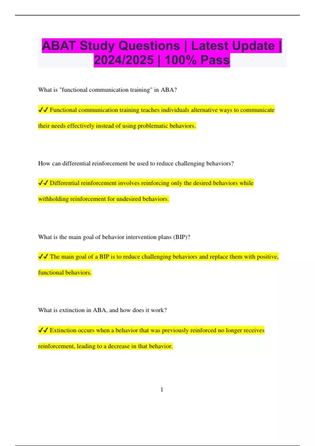 ABAT Study Questions | Latest Update | 2024/2025 | 100% Pass What is "functional communication training" in ABA? Functional communication training teaches individuals alternative ways to communicate their needs effectively instead of using problematic behaviors. How can differential reinforcement be used to reduce challenging behaviors? Differential reinforcement involves reinforcing only the desired behaviors while withholding reinforcement for undesired behaviors. What is the main goal of behavior intervention plans (BIP)? The main goal of a BIP is to reduce challenging behaviors and replace them with positive, functional behaviors. What is extinction in ABA, and how does it work? Extinction occurs when a behavior that was previously reinforced no longer receives reinforcement, leading to a decrease in that behavior. 2 How is data collection used in ABA therapy? Data collection is used to track the frequency, duration, and intensity of behaviors, helping to assess the effectiveness of interventions. What is a discriminative stimulus (SD) in ABA? A discriminative stimulus is a signal that a certain behavior will be reinforced if it occurs. What is the difference between continuous and intermittent reinforcement schedules? Continuous reinforcement delivers reinforcement every time a behavior occurs, while intermittent reinforcement provides reinforcement only some of the time. What is the significance of a "generalization" in behavior modification? Generalization is when a learned behavior occurs in different environments, situations, or with different people beyond the training setting. What is the purpose of a preference assessment in ABA? A preference assessment identifies items or activities that are motivating for the individual, which can be used as reinforcers during therapy. 3 How does prompt fading help in ABA therapy? Prompt fading gradually reduces assistance given during learning, allowing the individual to perform the behavior independently. What are the different types of reinforcement in ABA? Positive reinforcement involves adding something favorable to increase behavior, while negative reinforcement involves removing something