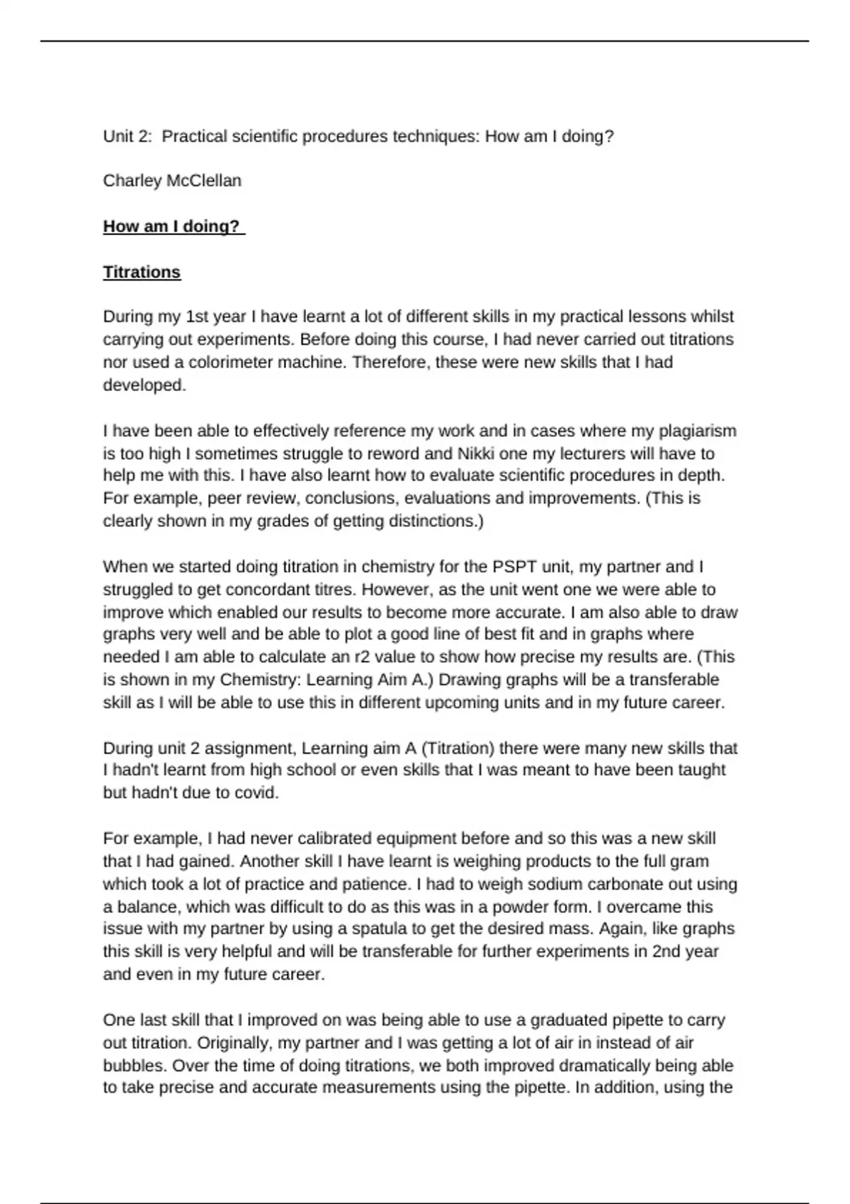 did titrations which helped me improve each time. One piece of feedback I was given
