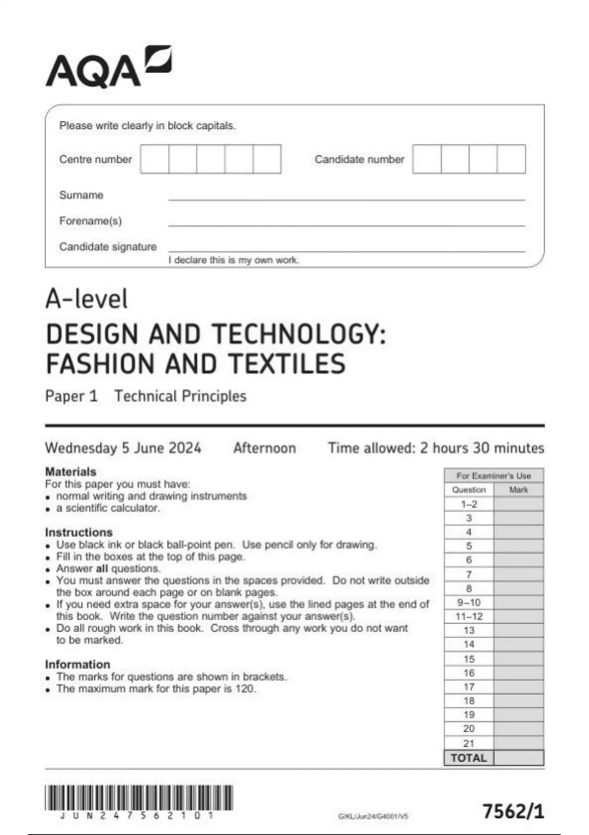 AQA A LEVEL DESIGN AND TECHNOLOGY fashion and textiles paper 1 technical principles question paper june /1