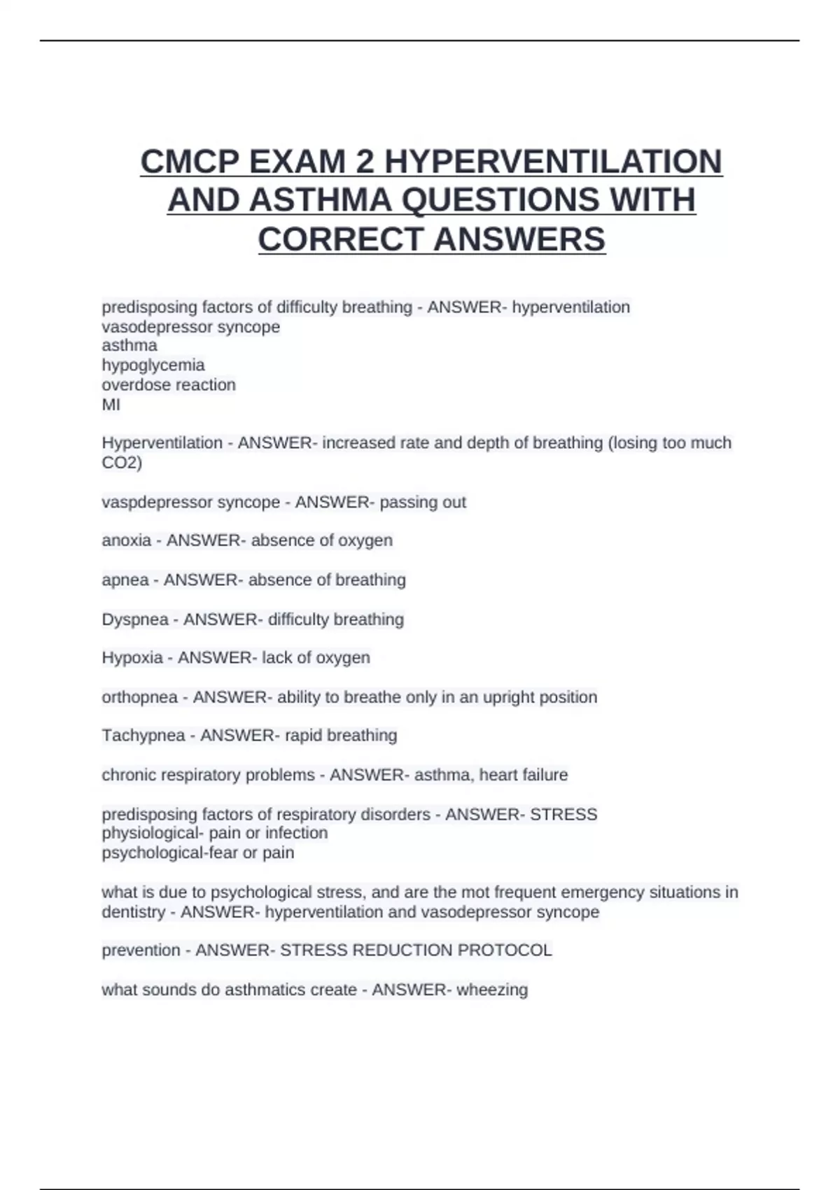 CMCP EXAM 2 HYPERVENTILATION AND ASTHMA QUESTIONS WITH CORRECT ANSWERS