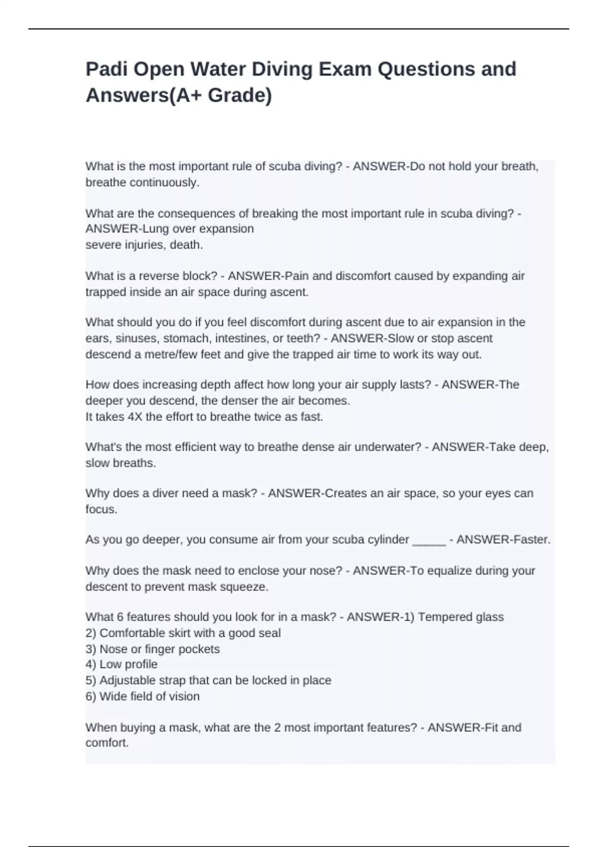 Padi Open Water Diving Exam Questions and Answers(A+ Grade)
