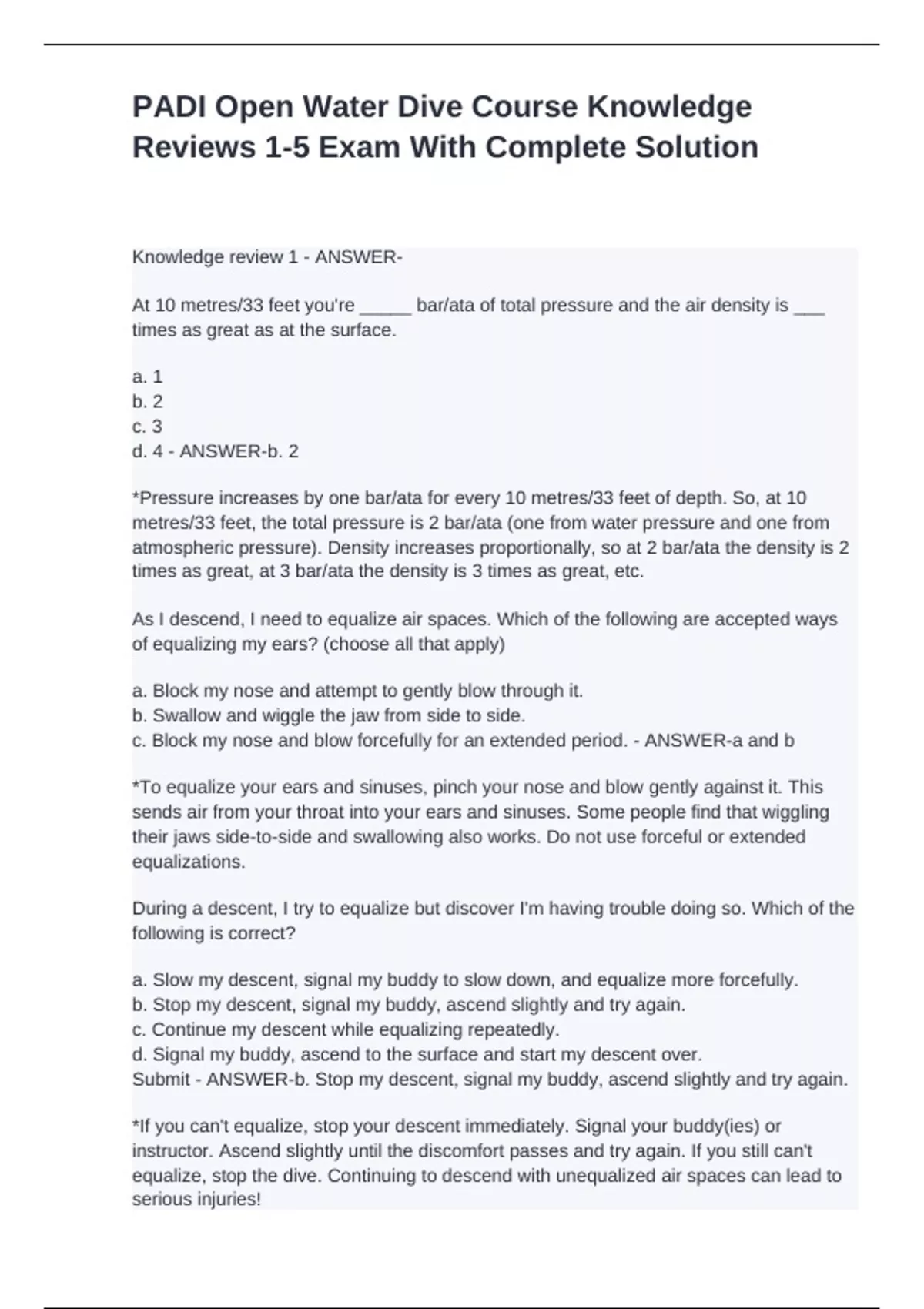 PADI Open Water Dive Course Knowledge Reviews 1-5 Exam With Complete Solution
