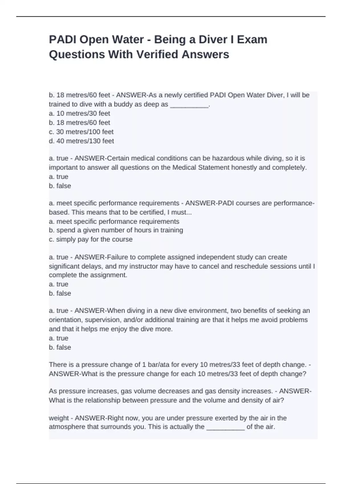 b. 18 metres/60 feet - ANSWER-As a newly certified PADI Open Water Diver, I will be