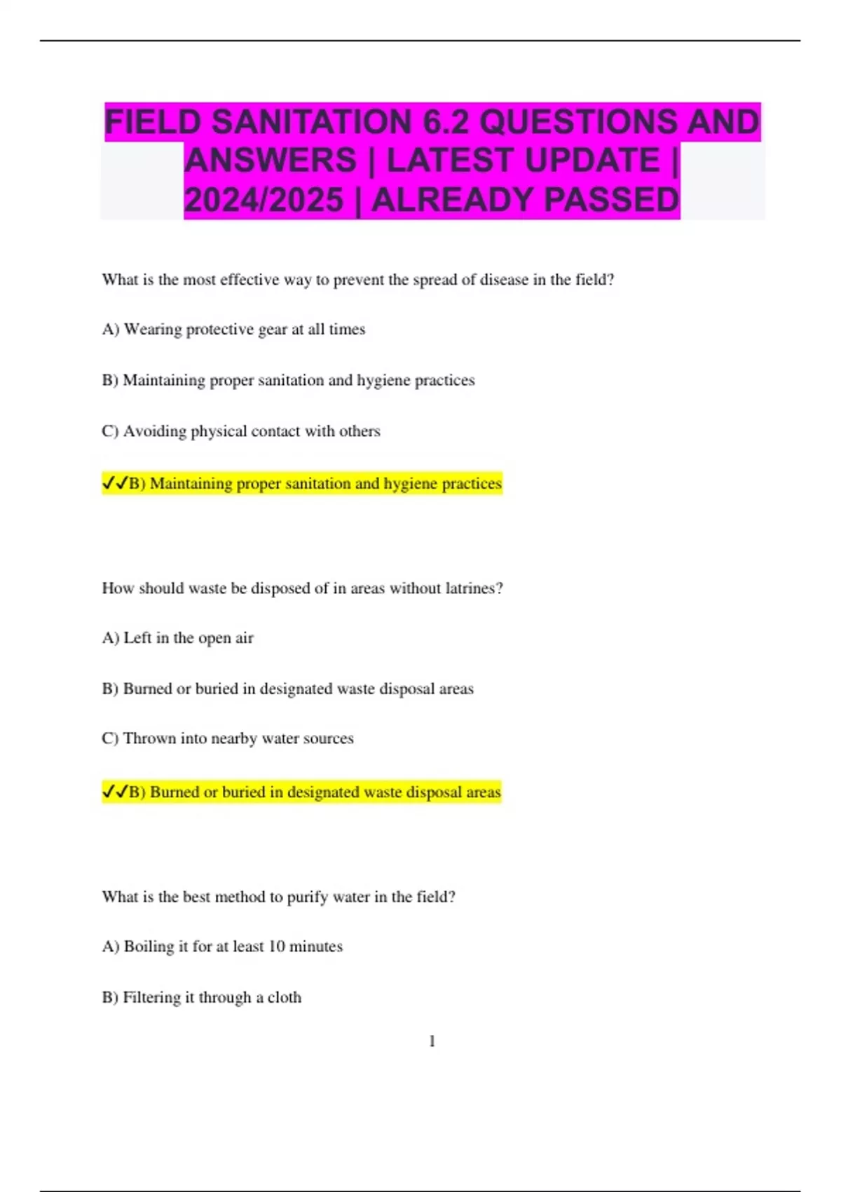 FIELD SANITATION 6.2 QUESTIONS AND ANSWERS | LATEST UPDATE | 2024/2025 | ALREADY PASSED What is the most effective way to prevent the spread of disease in the field? A) Wearing protective gear at all times B) Maintaining proper sanitation and hygiene practices C) Avoiding physical contact with others B) Maintaining proper sanitation and hygiene practices How should waste be disposed of in areas without latrines? A) Left in the open air B) Burned or buried in designated waste disposal areas C) Thrown into nearby water sources B) Burned or buried in designated waste disposal areas What is the best method to purify water in the field? A) Boiling it for at least 10 minutes B) Filtering it through a cloth 2 C) Letting it sit overnight A) Boiling it for at least 10 minutes Why is it important to control insect populations in the field? A) To maintain a cleaner environment B) To reduce the transmission of diseases such as malaria and dengue fever C) To ensure safe food consumption B) To reduce the transmission of diseases such as malaria and dengue fever What is the primary function of a field sanitation team? A) Conducting medical examinations B) Enforcing rules and regulations C) Implementing and overseeing hygiene and sanitation measures C) Implementing and overseeing hygiene and sanitation measures When should soldiers wash their hands in the field? A) Only after eating B) Before eating, after using the latrine, and after handling waste 3 C) Only at the end of the day B) Before eating, after using the latrine, and after handling