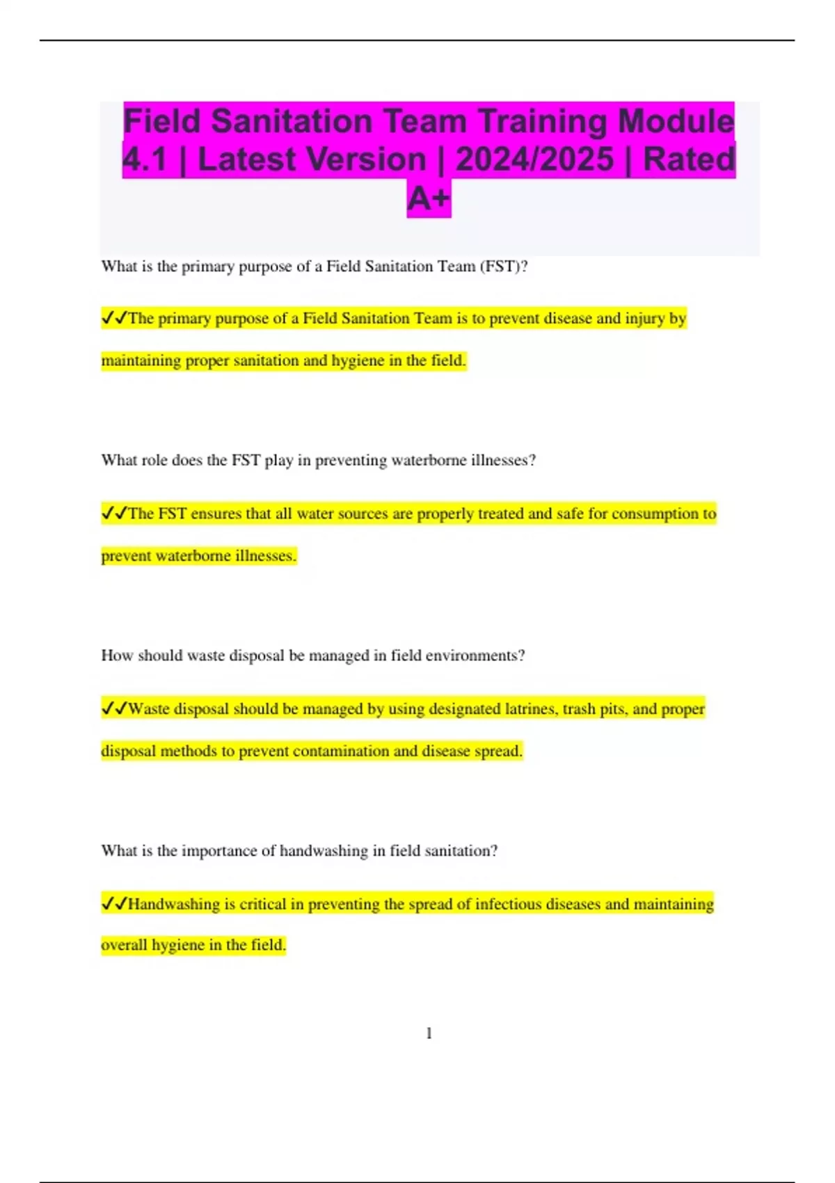 Field Sanitation Team Training Module 4.1 | Latest Version | 2024/2025 | Rated A+ What is the primary purpose of a Field Sanitation Team (FST)? The primary purpose of a Field Sanitation Team is to prevent disease and injury by maintaining proper sanitation and hygiene in the field. What role does the FST play in preventing waterborne illnesses? The FST ensures that all water sources are properly treated and safe for consumption to prevent waterborne illnesses. How should waste disposal be managed in field environments? Waste disposal should be managed by using designated latrines, trash pits, and proper disposal methods to prevent contamination and disease spread. What is the importance of handwashing in field sanitation? Handwashing is critical in preventing the spread of infectious diseases and maintaining overall hygiene in the field. 2 What are the key responsibilities of the FST in food safety? The FST ensures that food is stored, prepared, and consumed in a safe and sanitary manner to prevent foodborne illnesses. How can the FST ensure the proper disposal of hazardous materials? The FST is responsible for identifying hazardous materials and ensuring they are disposed of in accordance with environmental and safety regulations. What is the significance of vector control in the field? Vector control is important to prevent the spread of diseases carried by insects, rodents, and other animals. How should potable water be stored in field conditions? Potable water should be stored in clean, covered containers to prevent contamination and ensure safe drinking water. What steps can the FST take to maintain personal hygiene in the field? The FST encourages regular bathing,