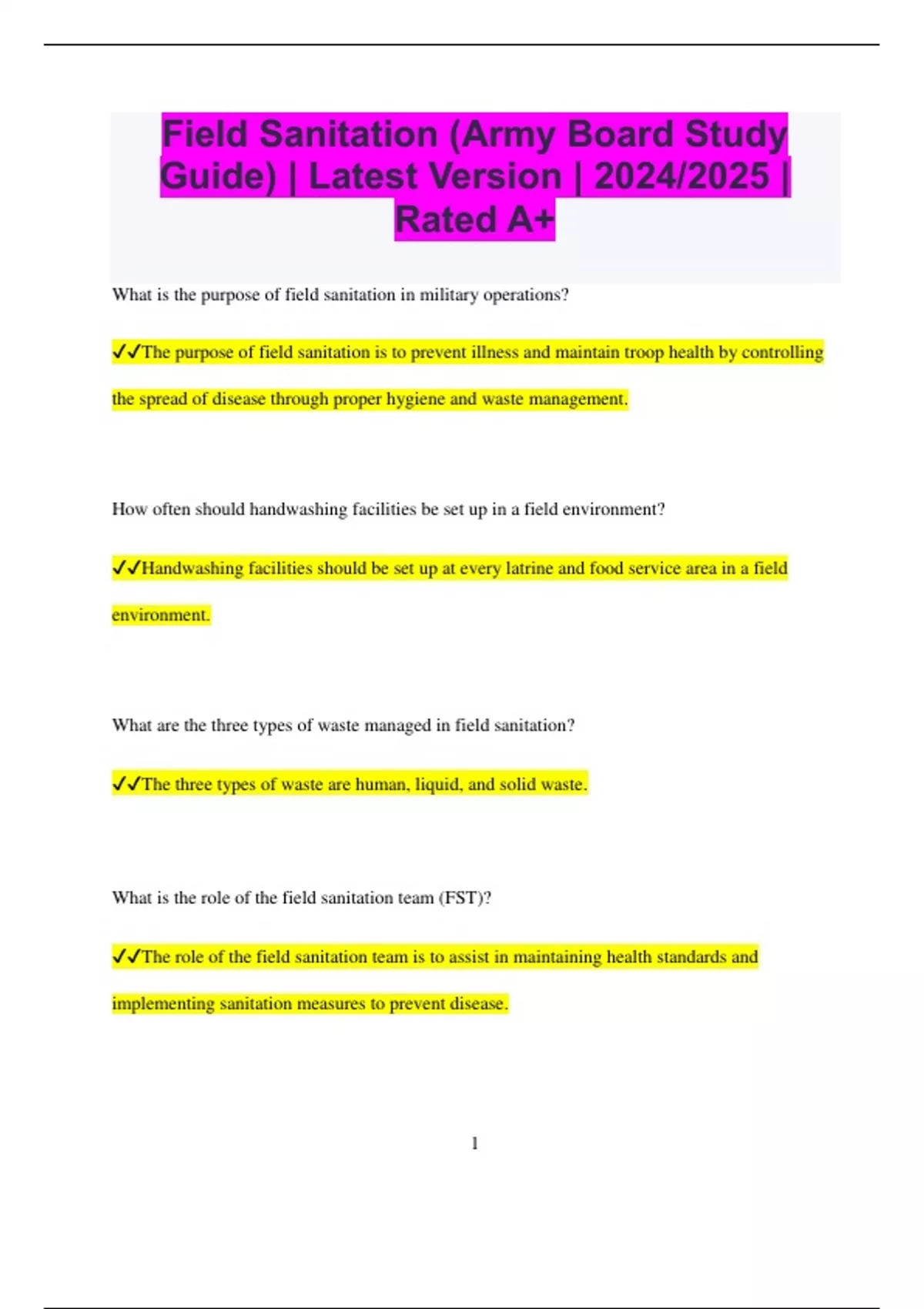 Field Sanitation (Army Board Study Guide) | Latest Version | 2024/2025 | Rated A+