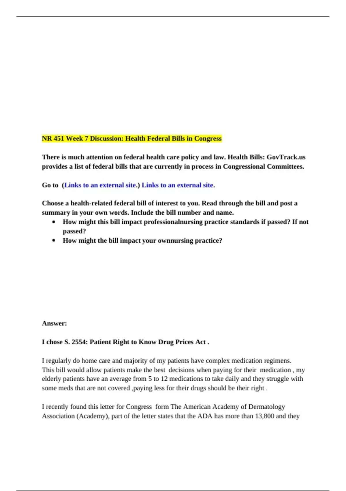 NR 451 Week 7 Discussion, Health Federal Bills in Congress There is much attention on federal health care policy and law. Health Bills: GovT provides a list of federal bills that are currently in process in Congressional Committees. Go to Choose a health-related federal bill of interest to you. Read through the bill and post a summary in your own words. Include the bill number and name. How might this bill impact professional nursing practice standards if passed? If not passed? How might the bill impact your own nursing practice?