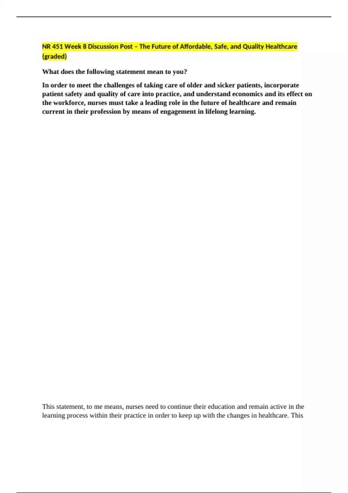 NR 451 Week 8 Discussion, Your Future What Does the Future Hold? What does the following statement mean to you? In order to meet the challenges of taking care of older and sicker patients, incorporate patient safety and quality of care into practice, and understand economics and its effect on the workforce, nurses must take a leading role in the future of healthcare.