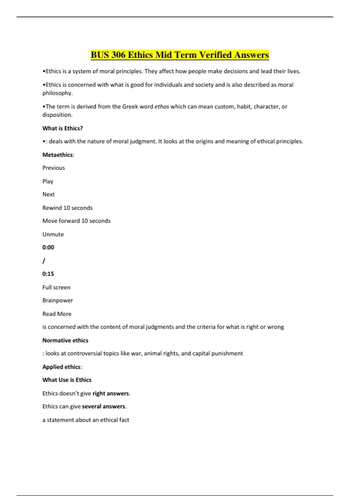 BUS 306 Ethics Mid Term Verified Answers •Ethics is a system of moral principles. They affect how people make decisions and lead their lives. •Ethics is concerned with what is good for individuals and society and is also described as moral philosophy. •The term is derived from the Greek word ethos which can mean custom, habit, character, or disposition. What is Ethics? •: deals with the nature of moral judgment. It looks at the origins and meaning of ethical principles. Metaethics: Previous Play Next Rewind 10 seconds Move forward 10 seconds Unmute 0:00 / 0:15 Full screen Brainpower Read More is concerned with the content of moral judgments and the criteria for what is right or wrong Normative ethics : looks at controversial topics like war, animal rights, and capital punishment Applied ethics: What Use is Ethics Ethics doesn’t give right answers. Ethics can give several answers. a statement about an ethical fact Moral realism a statement about my own feelings Subjectivism expressing my feelings Emotivism giving an instruction or recommendations Prescriptivism •Looks at moral character, rather than ethical duties and rules, or the consequences of actions. Virtue Ethics ethics and morals ethics are a social system and morals are individual. ethics is because society says it is the right thing to do. mor