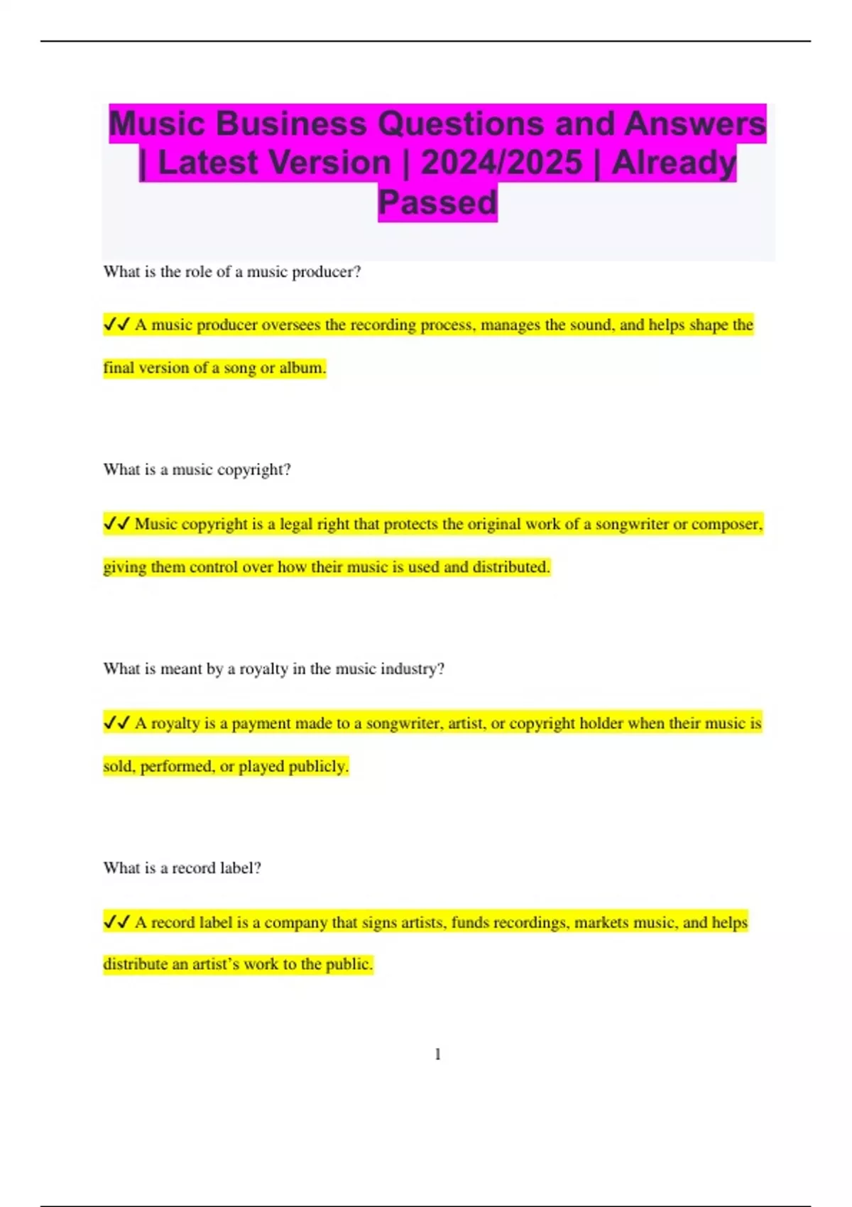 Music Business Questions and Answers | Latest Version | 2024/2025 | Already Passed What is the role of a music producer? A music producer oversees the recording process, manages the sound, and helps shape the final version of a song or album. What is a music copyright? Music copyright is a legal right that protects the original work of a songwriter or composer, giving them control over how their music is used and distributed. What is meant by a royalty in the music industry? A royalty is a payment made to a songwriter, artist, or copyright holder when their music is sold, performed, or played publicly. What is a record label? A record label is a company that signs artists, funds recordings, markets music, and helps distribute an artist’s work to the public. 2 What does an A&R (Artist and Repertoire) do? An A&R is responsible for scouting new talent, helping artists develop their sound, and overseeing the recording process for a record label. What is a music publisher? A music publisher manages the rights to a songwriter’s music, ensuring that they get paid when their songs are used in media or performed. What is synchronization (sync) licensing? Sync licensing is the process of granting permission for music to be used in films, TV shows, commercials, or video games. What is meant by distribution in the music business? Distribution is the process of getting music from the artist or record label to the public, whether through physical sales or digital streaming platforms. What is streaming in the music industry? Streaming is the method of listening to music online without downloading it, through platforms like Spotify or Apple Music.
