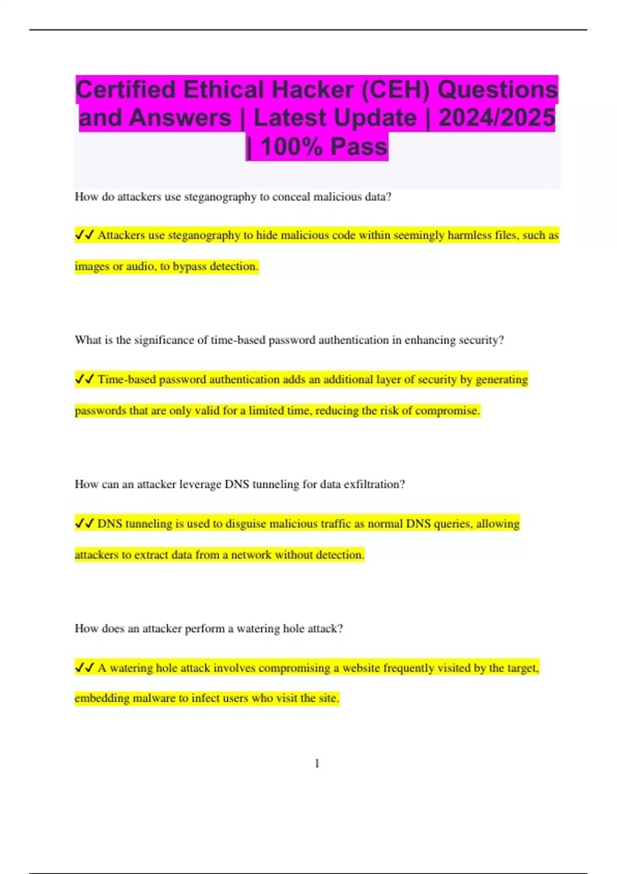 Certified Ethical Hacker (CEH) Questions and Answers | Latest Update | 2024/2025 | 100% Pass How do attackers use steganography to conceal malicious data? Attackers use steganography to hide malicious code within seemingly harmless files, such as images or audio, to bypass detection. What is the significance of time-based password authentication in enhancing security? Time-based password authentication adds an additional layer of security by generating passwords that are only valid for a limited time, reducing the risk of compromise. How can an attacker leverage DNS tunneling for data exfiltration? DNS tunneling is used to disguise malicious traffic as normal DNS queries, allowing attackers to extract data from a network without detection. How does an attacker perform a watering hole attack? A watering hole attack involves compromising a website frequently visited by the target, embedding malware to infect users who visit the site. 2 What is a common countermeasure for mitigating man-in-the-browser attacks? Implementing secure browser extensions and end-to-end encryption helps prevent attackers from manipulating browser sessions. How do attackers evade detection with polymorphic malware? Polymorphic malware changes its code each time it executes, making it harder for signature- based detection systems to identify. Why is memory analysis important during an incident investigation? Memory analysis can uncover artifacts such as running processes, malware traces, and network connections that are not stored on disk, providing critical evidence. What is the role of command and control (C2) servers in botnet attacks? C2 servers manage infected machines (bots) in a botnet, allowing attackers to issue commands, exfiltrate data, or launch attacks remotely. What does fuzz testing involve in vulnerability discovery? Fuzz testing involves providing random or unexpected inputs to a program to identify potential vulnerabilities by observing how it handles the input. 3 How does an attacker use SQL injection to retrieve unauthorized data from a database? SQL injection allows an attacker to manipulate database queries by injecting malicious SQL code into an input field, retrieving or modifying data. What are some signs that a system may have been compromised by rootkit malware? Signs include hidden processes, missing system files, unusual system performance, and tampered security software.