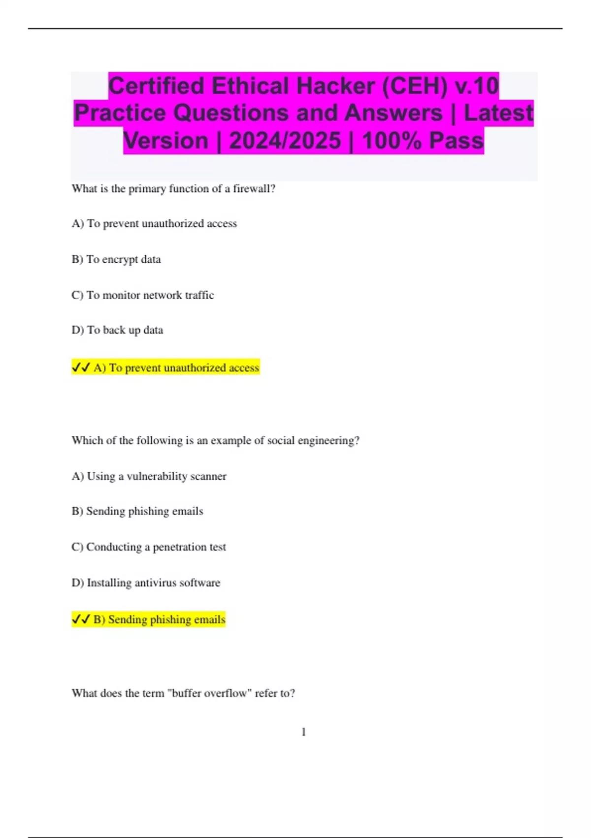 Certified Ethical Hacker (CEH) v.10 Practice Questions and Answers | Latest Version | 2024/2025 | 100% Pass What is the primary function of a firewall? A) To prevent unauthorized access B) To encrypt data C) To monitor network traffic D) To back up data A) To prevent unauthorized access Which of the following is an example of social engineering? A) Using a vulnerability scanner B) Sending phishing emails C) Conducting a penetration test D) Installing antivirus software B) Sending phishing emails What does the term "buffer overflow" refer to? 2 A) A type of denial-of-service attack B) An attack that exploits memory allocation C) A method to encrypt data D) A type of firewall rule B) An attack that exploits memory allocation Which of the following tools is commonly used for network scanning? A) Wireshark B) Nmap C) Metasploit D) Nessus B) Nmap What is the purpose of a VPN (Virtual Private Network)? A) To hide malware B) To create a secure connection over the internet C) To block network traffic D) To perform vulnerability scans 3 B) To create a secure connection over the internet Which attack involves intercepting and altering communications between two parties? A) SQL injection B) Cross-site scripting C) Man-in-the-middle attack D) Phishing C) Man-in-the-middle attack What is the function of a honeypot in cybersecurity? A) To secure network access B) To attract and analyze attackers C) To encrypt sensitive data D) To create backups