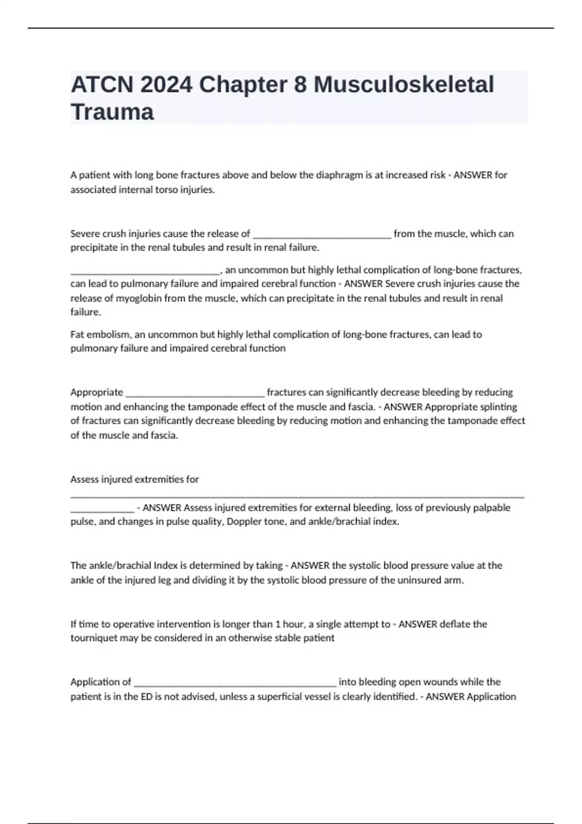 ATCN 2024 Chapter 8 Musculoskeletal Trauma Appropriate __________________________ fractures can significantly decrease bleeding by reducing motion and enhancing the tamponade effect of the muscle and fascia. Appropriate splinting of fractures can significantly decrease bleeding by reducing motion and enhancing the tamponade effect of the muscle and fascia. Assess injured extremities for _________________________________________________________________________________________________ Assess injured extremities for external bleeding, loss of previously palpable pulse, and changes in pulse quality, Doppler tone, and ankle/brachial index. The ankle/brachial Index is determined by taking the systolic blood pressure value at the ankle of the injured leg and dividing it by the systolic blood pressure of the uninsured arm.