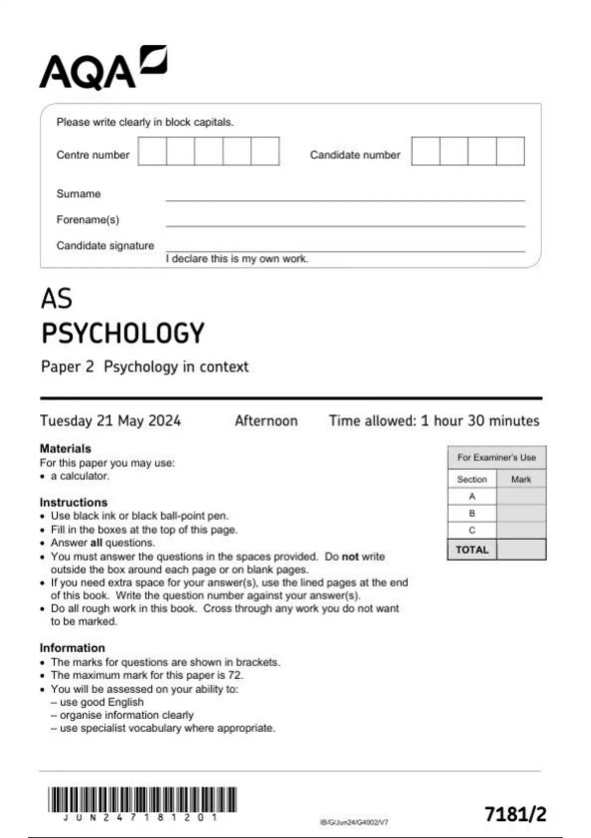 AQA AS PSYCHOLOGY 7181/2 Paper 2 Psychology in context question paper june 2024