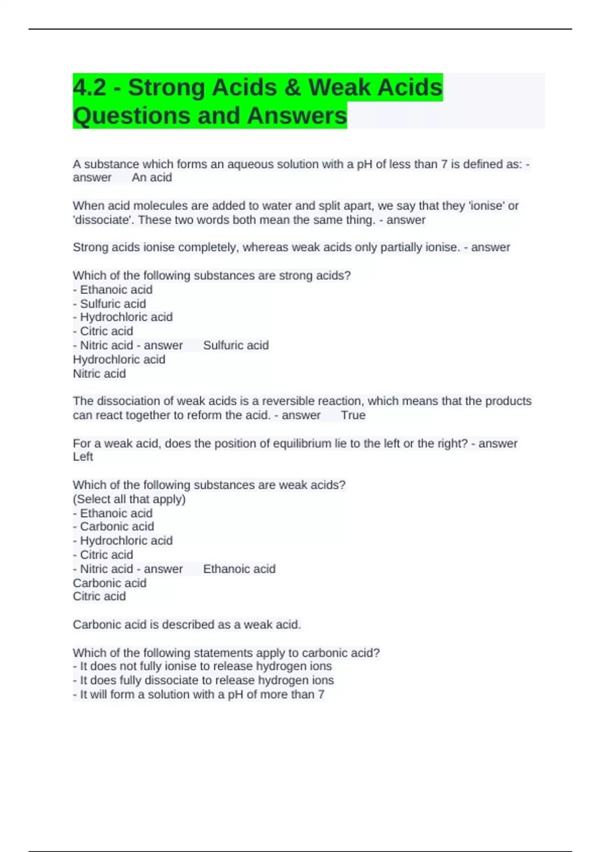 - Nitric acid - answer Ethanoic acid