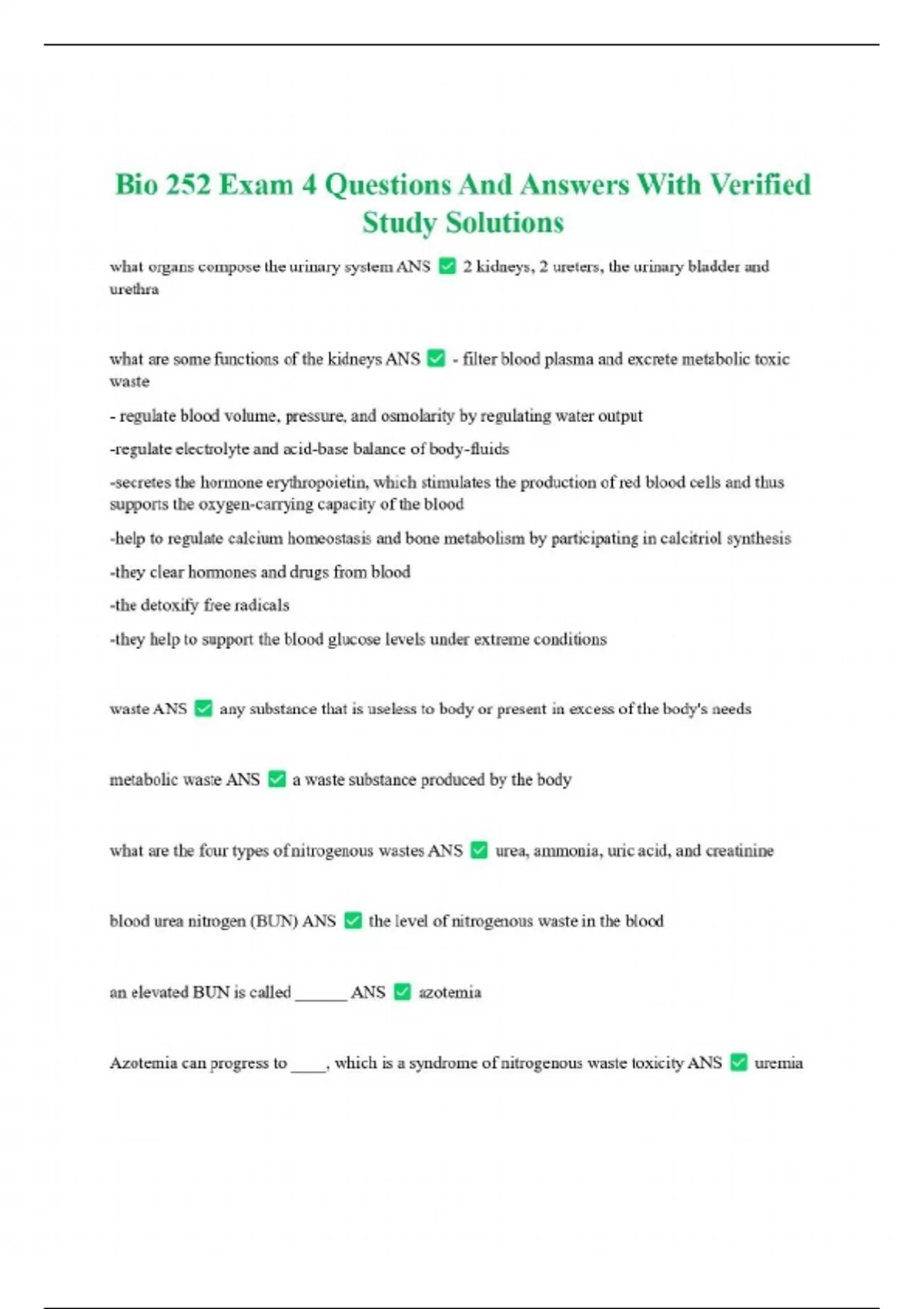 Bio 252 Exam 4 Questions And Answers With Verified Study Solutions what organs compose the urinary system ANS 2 kidneys, 2 ureters, the urinary bladder and urethra what are some functions of the kidneys ANS - filter blood plasma and excrete metabolic toxic waste - regulate blood volume, pressure, and osmolarity by regulating water output -regulate electrolyte and acid-base balance of body-fluids -secretes the hormone erythropoietin, which stimulates the production of red blood cells and thus supports the oxygen-carrying capacity of the blood -help to regulate calcium homeostasis and bone metabolism by participating in calcitriol synthesis -they clear hormones and drugs from blood -the detoxify free radicals -they help to support the blood glucose levels under extreme conditions waste ANS any substance that is useless to body or present in excess of the body's needs metabolic waste ANS a waste substance produced by the body
