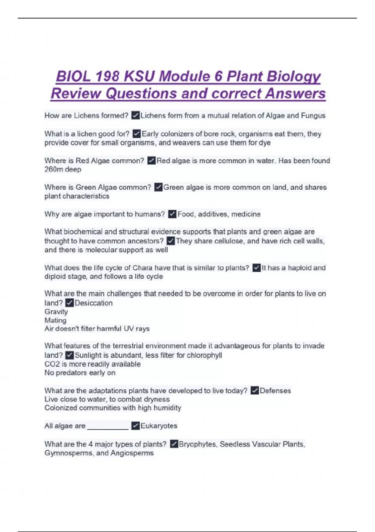 BIOL 198 KSU Module 6 Plant Biology Review Questions and correct Answers