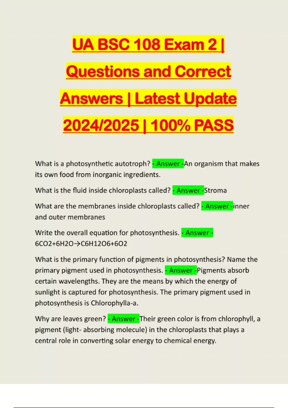 UA BSC 108 Exam 2 | Questions and Correct Answers | Latest Update 2024/2025 | 100% PASS What is a photosynthetic autotroph? - Answer -An organism that makes its own food from inorganic ingredients. What is the fluid inside chloroplasts called? - Answer -Stroma What are the membranes inside chloroplasts called? - Answer -inner and outer membranes Write the overall equation for photosynthesis. - Answer - 6CO2+6H2O→C6H12O6+6O2 What is the primary function of pigments in photosynthesis? Name the primary pigment used in photosynthesis. - Answer -Pigments absorb certain wavelengths. They are the means by which the energy of sunlight is captured for photosynthesis. The primary pigment used in photosynthesis is Chlorophylla-a. Why are leaves green? - Answer -Their green color is from chlorophyll, a pigment (light- absorbing molecule) in the chloroplasts that plays a central role in converting solar energy to chemical energy.How and where does water enter a plant? - Answer -Water enters root hair cells by osmosis. How and where does carbon dioxide enter a plant? - Answer -Carbon Dioxide diffuses through small holes in the underside of leaves, called the stomata. The light reactions take place in three stages. Name the stages and summarize the events of each stage