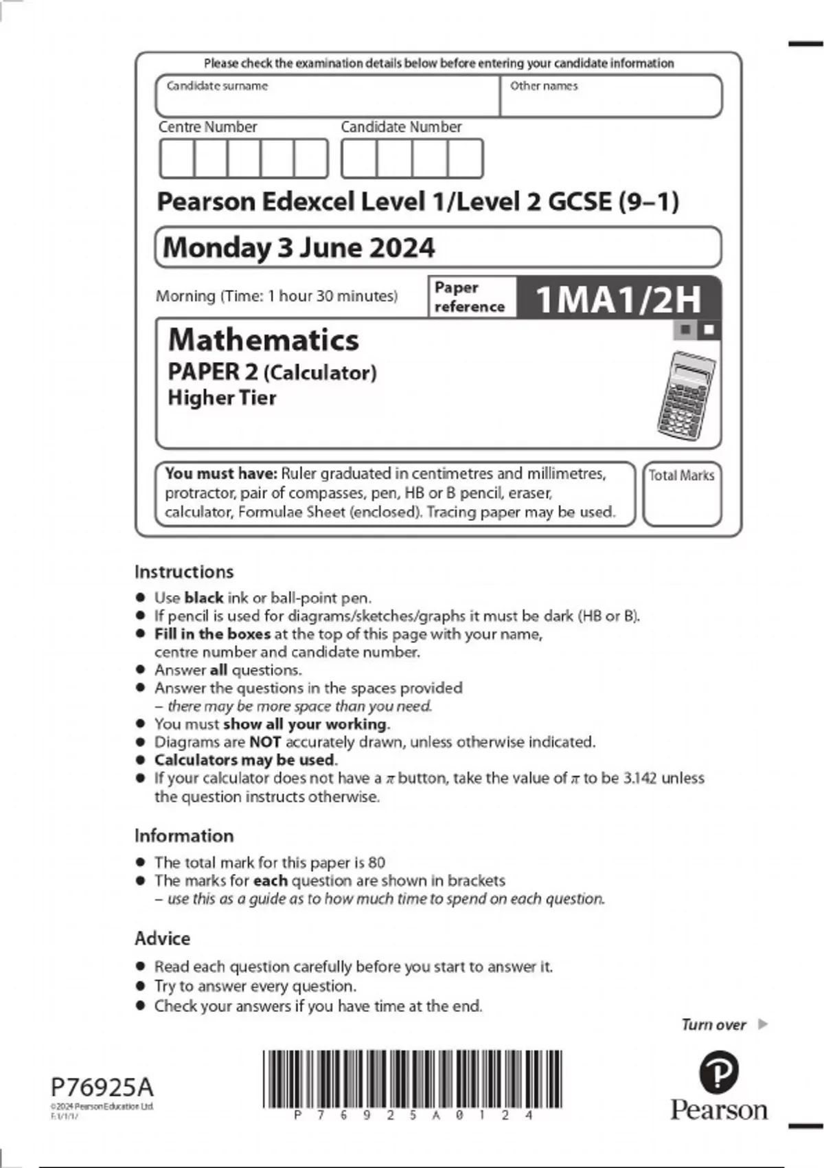 GCSE EDEXCEL June 2025 Higher Mathematics Paper 2 Calculator