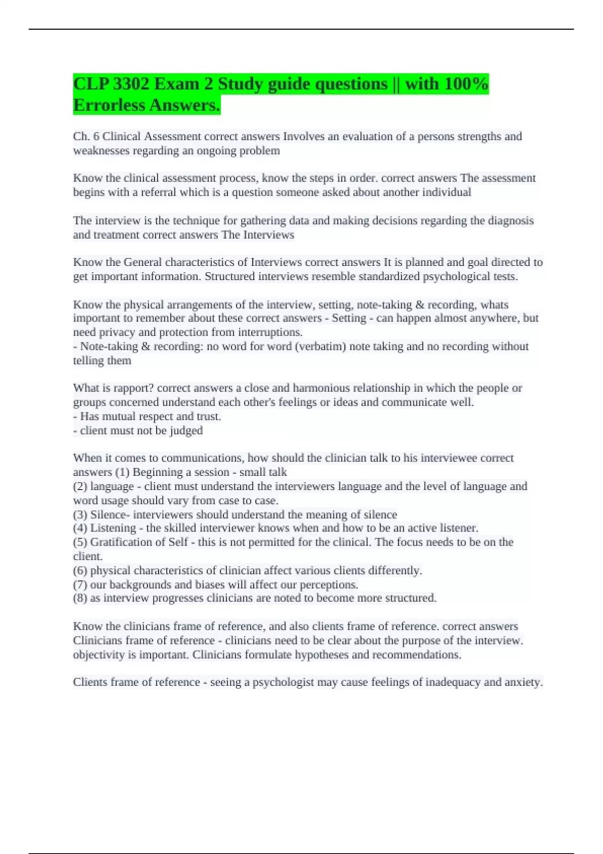Ch. 6 Clinical Assessment correct answers Involves an evaluation of a persons strengths and