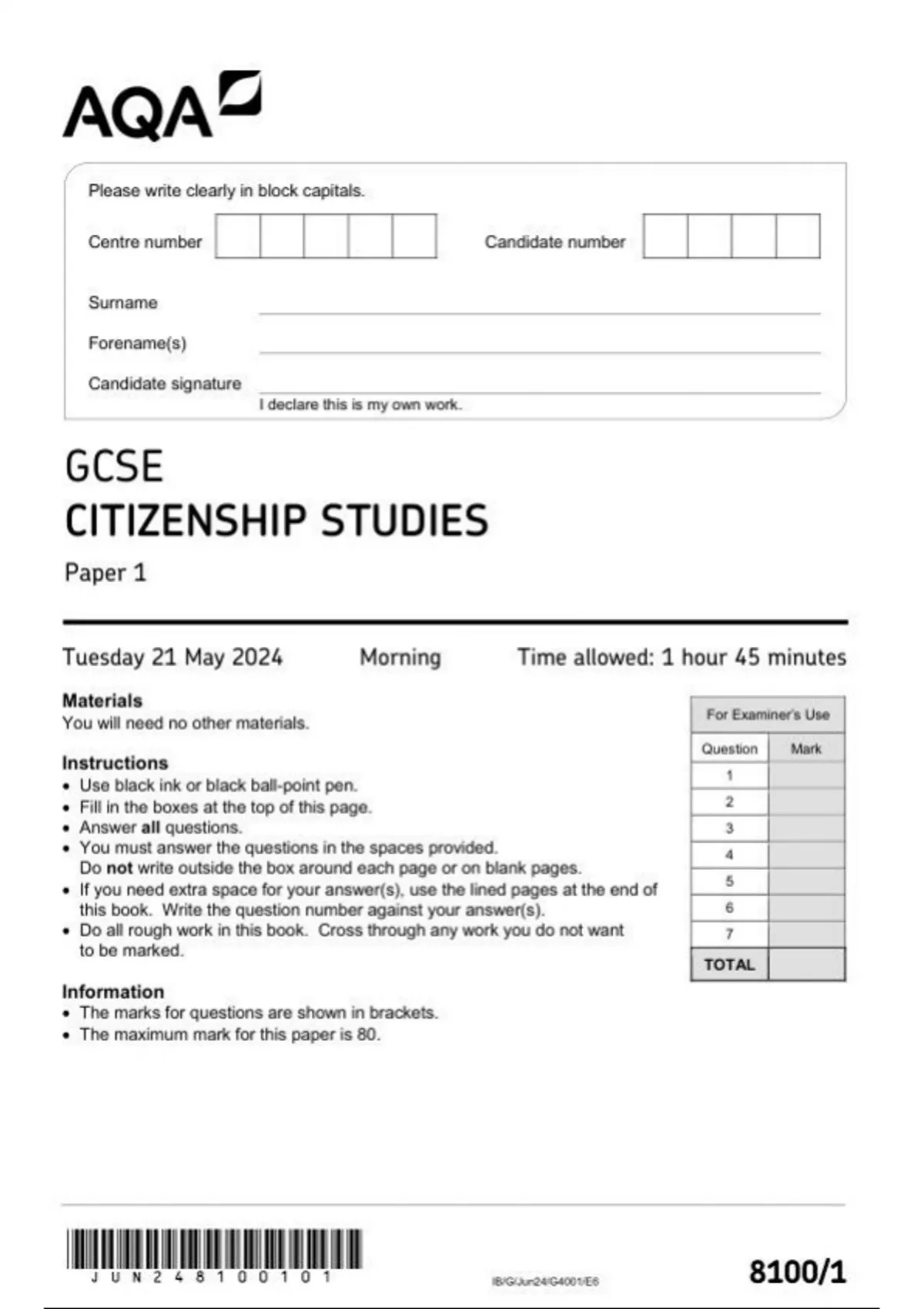 AQA GCSE CITIZENSHIP STUDIES Paper 1 question paper 2024 june 8100/1