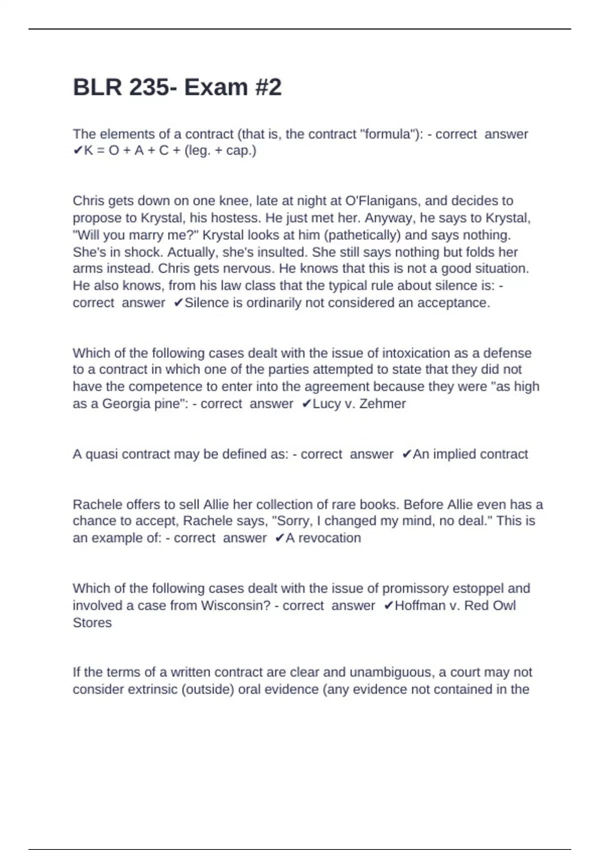 BLR 235 Questions with complete solution 2024/2025 BLR 235- Exam #2 The elements of a contract (that is, the contract "formula"): - correct answer K = O + A + C + (leg. + cap.) Chris gets down on one knee, late at night at O'Flanigans, and decides to propose to Krystal, his hostess. He just met her. Anyway, he says to Krystal, "Will you marry me?" Krystal looks at him (pathetically) and says nothing. She's in shock. Actually, she's insulted. She still says nothing but folds her arms instead. Chris gets nervous. He knows that this is not a good situation. He also knows, from his law class that the typical rule about silence is: - correct answer Silence is ordinarily not considered an acceptance. Which of the following cases dealt with the issue of intoxication as a defense to a contract in which one of the parties attempted to state that they did not have the competence to enter into the agreement because they were "as high as a Georgia pine": - correct answer Lucy v. Zehmer A quasi contract may be defined as: - correct answer An implied contract Rachele offers t