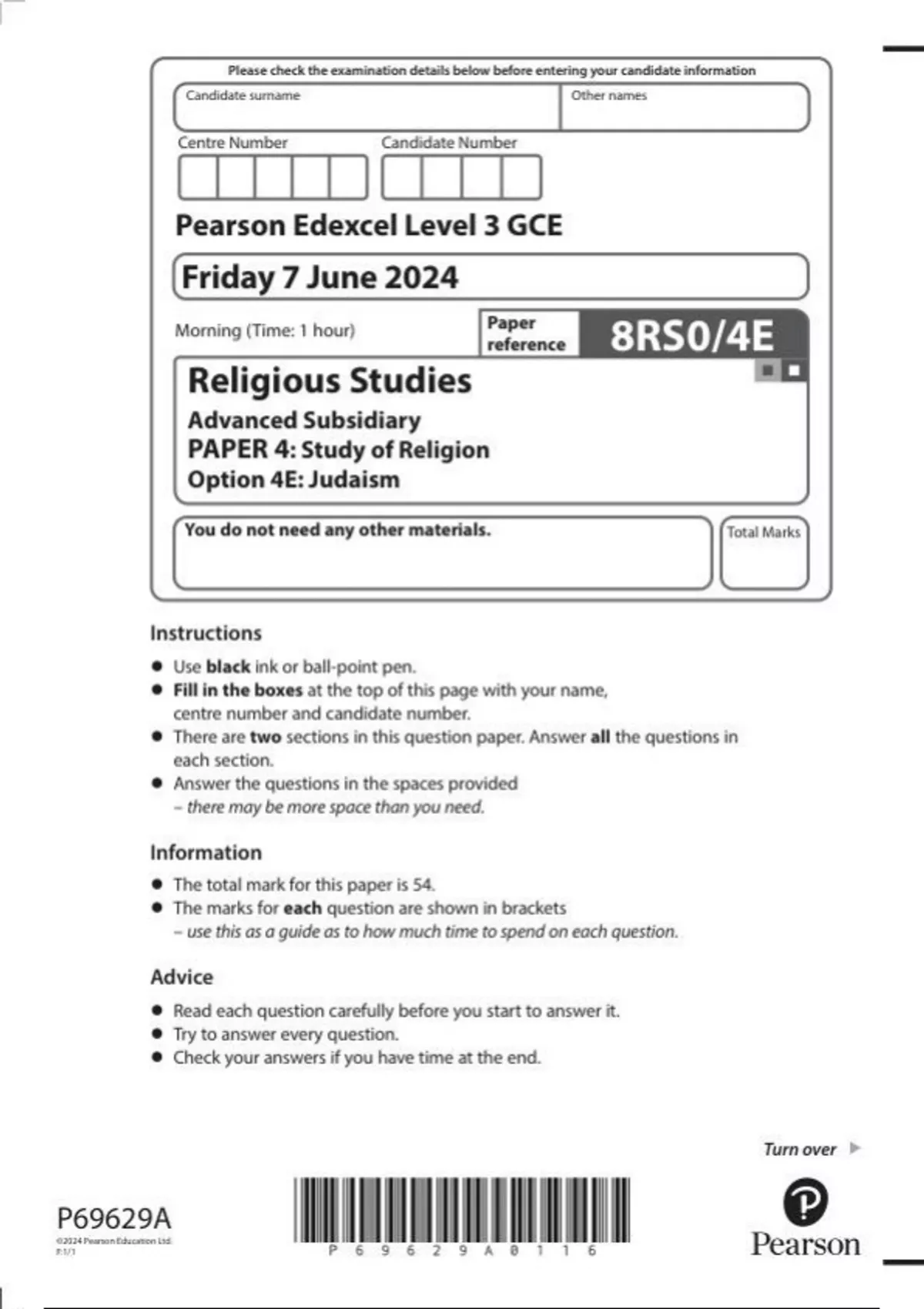 Pearson Edexcel AS Religious Studies paper 4E June 2024 QUESTION PAPER (8rs0-4E)-Judaism