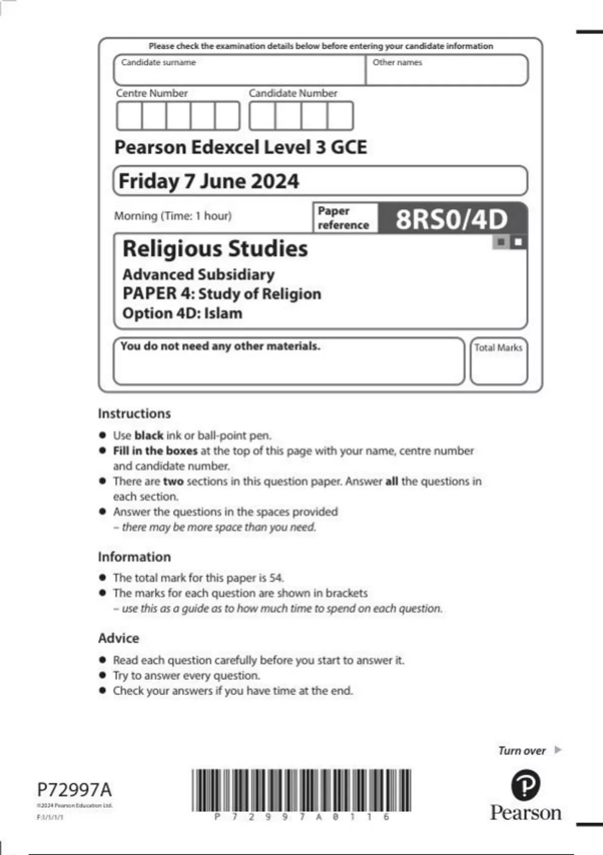 Pearson Edexcel AS Religious Studies paper 4D June 2024 QUESTION PAPER (8rs0-4D)-Islam