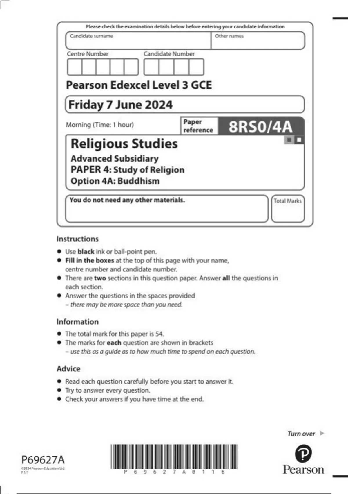 Pearson Edexcel AS Religious Studies paper 4A June 2024 QUESTION PAPER (8rs0-4A)-Buddhism