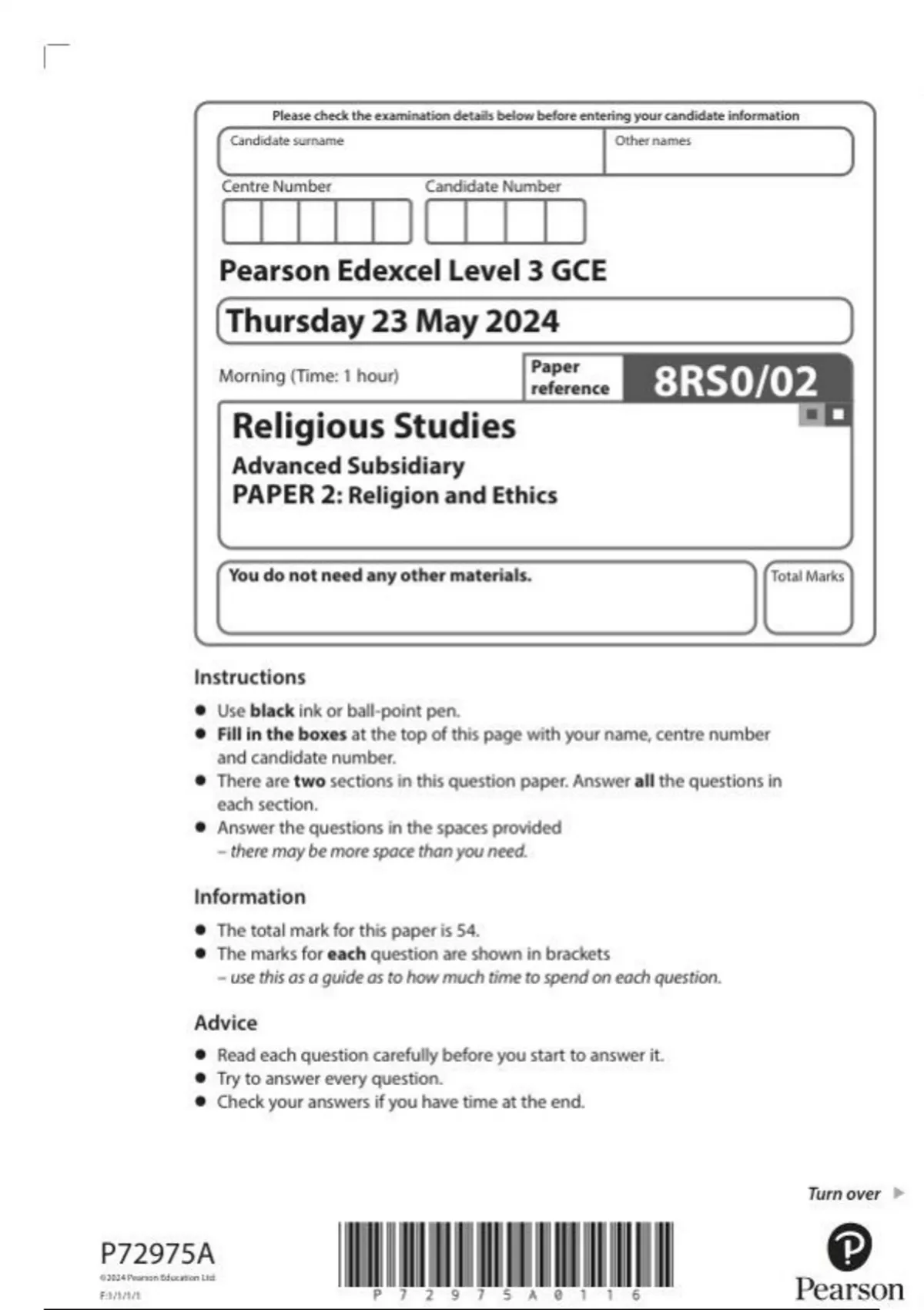 Pearson Edexcel AS Religious Studies paper 2 June 2024 QUESTION PAPER (8rs0-2)-Religion and Ethics
