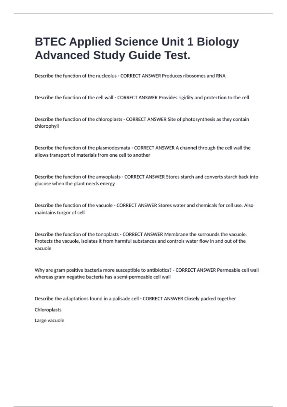 Describe the function of the vacuole - CORRECT ANSWER Stores water and chemicals for cell use. Also
