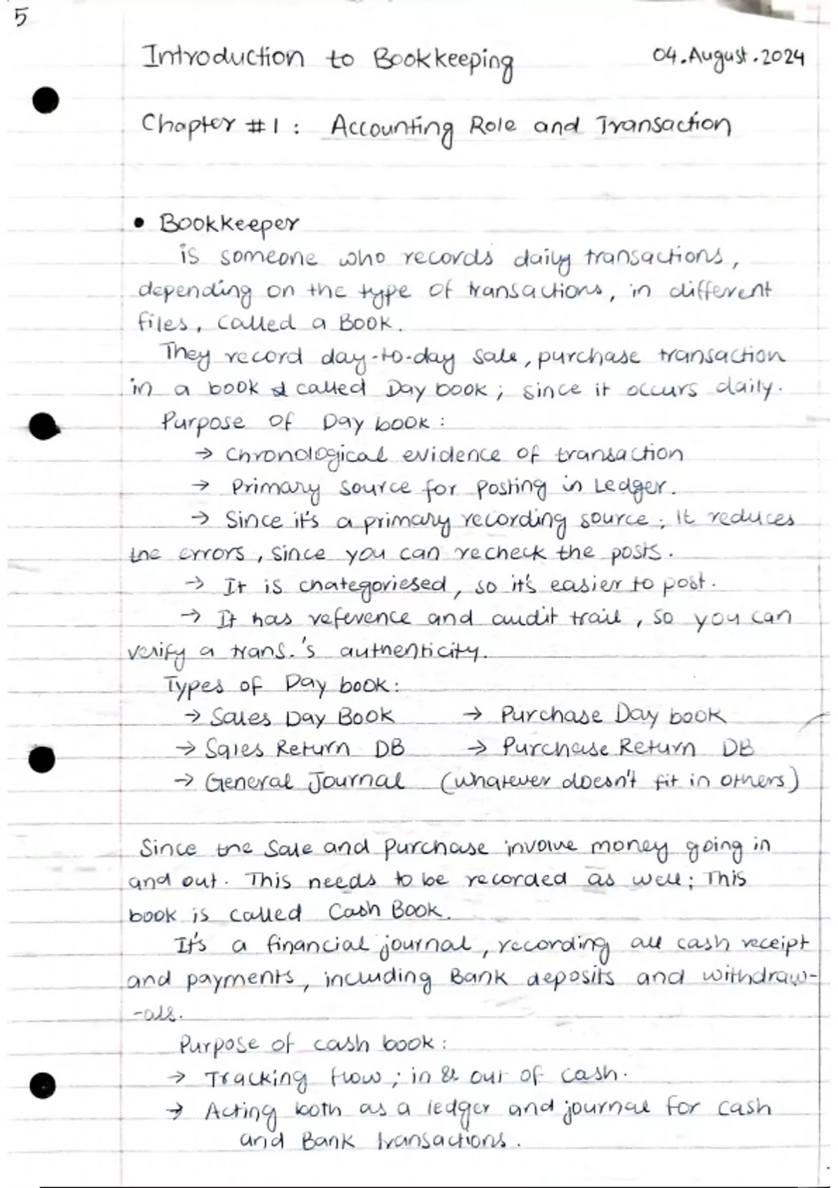 These are short summarised notes, written from self-studying. Helpful for anyone looking for a different view on AAT level 2, Introduction to Bookkeeping Unit.. This is just Chapter one, labelled Accounting roles and Transactions. I'll upload otheres as well. My reference is the book, provided from Premier training ltd, as a main study book. Mostly these notes are my paraphrasing and twist of words, from my previous knowledge, and are Not direct word-to-word from the book. These notes can help break down the basic concepts to bite size pieces, since they are listed, labelled OR in small paragraphs. I highly recommend that you read the following heading included to see if you get what you need: Bookkeeper Daybooks Types of daybooks Purpose of Cashbook Type of Cashbook Key difference between Cashbook, Daybook, and Books of prime entry Accountants Accounting technicians Types of Business Soletrader Partnership Limited Company and it's two division Limited Liability Partnership Not-for-profit business and it's three division Other type of business Organisational structure (Hierarchical, Tall, Flat) Accounting Transactions Retaining Documents