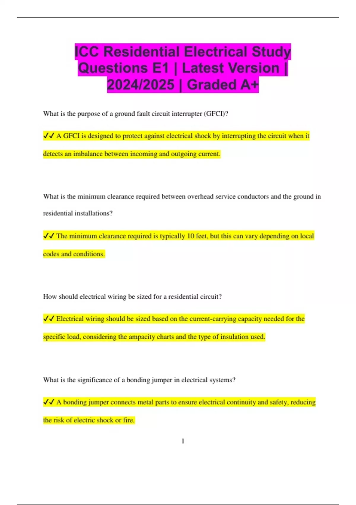 ICC Residential Electrical Study Questions E1 | Latest Version | 2024/2025 | Graded A+ What is the purpose of a ground fault circuit interrupter (GFCI)? A GFCI is designed to protect against electrical shock by interrupting the circuit when it detects an imbalance between incoming and outgoing current. What is the minimum clearance required between overhead service conductors and the ground in residential installations? The minimum clearance required is typically 10 feet, but this can vary depending on local codes and conditions. How should electrical wiring be sized for a residential circuit? Electrical wiring should be sized based on the current-carrying capacity needed for the specific load, considering the ampacity charts and the type of insulation used. What is the significance of a bonding jumper in electrical systems? A bonding jumper connects metal parts to ensure electrical continuity and safety, reducing the risk of electric shock or fire. 2 What are the requirements for installing electrical outlets in residential garages? Electrical outlets in garages must be GFCI-protected and installed at least 12 inches above the floor to minimize exposure to moisture. How does the NEC define a dwelling unit? A dwelling unit is defined as a single unit providing complete, independent living facilities for one or more persons, including provisions for sleeping, cooking, and sanitation. What is the purpose of a service entrance conductors? Service entrance conductors are responsible for bringing electricity from the utility supply to the main service panel of a building. What is the role of the main breaker in a residential electrical panel? The main breaker serves as the primary disconnecting means for the electrical service, allowing for the safe shutdown of all circuits in the panel. What are the requirements for outdoor electrical installations? 3 Outdoor electrical installations must use weather-resistant materials, have proper grounding, and comply with NEC guidelines for protection against moisture and physical damage. How is a load calculation performed for a residential service? A load calculation is performed by summing the wattage of all fixed appliances, lighting, and other electrical loads to determine the total demand on the service. What safety measures should be taken when working with electrical panels? Safety measures include wearing personal protective equipment (PPE), using insulated tools, and ensuring that the panel is de-energized before starting work. What is the purpose of an AFCI (arc-fault circuit interrupter) in residential wiring? An AFCI is designed to detect and interrupt arc faults that could lead to electrical fires, providing an added layer of safety in residential