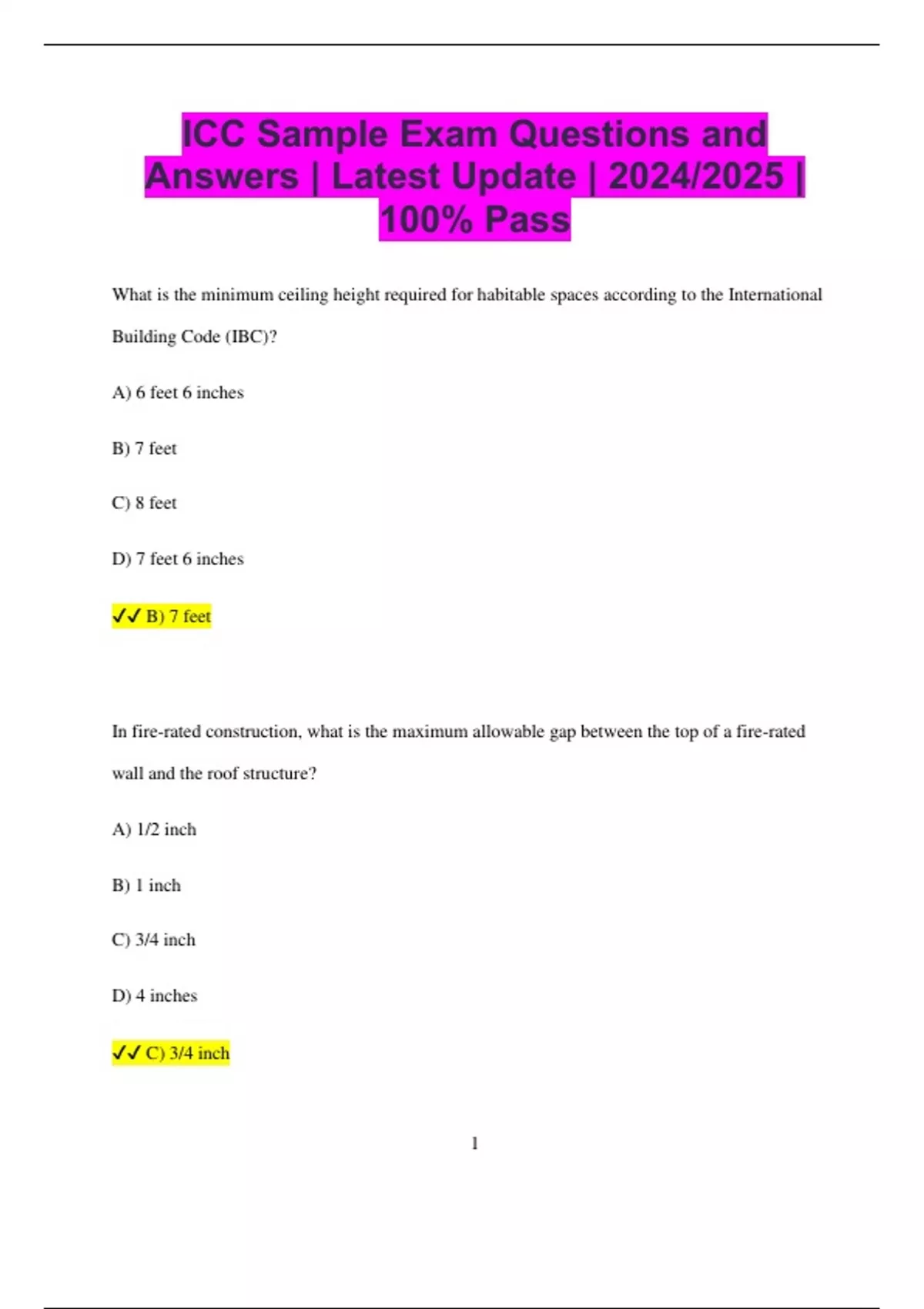 ICC Sample Exam Questions and Answers | Latest Update | 2024/2025 | 100% Pass What is the minimum ceiling height required for habitable spaces according to the International Building Code (IBC)? A) 6 feet 6 inches B) 7 feet C) 8 feet D) 7 feet 6 inches B) 7 feet In fire-rated construction, what is the maximum allowable gap between the top of a fire-rated wall and the roof structure? A) 1/2 inch B) 1 inch C) 3/4 inch D) 4 inches C) 3/4 inch 2 Which type of construction is considered non-combustible according to the International Building Code? A) Type III B) Type V C) Type I D) Type II C) Type I What is the minimum required fire-resistance rating for a corridor in a building with an occupancy classification of R (residential)? A) 30 minutes B) 45 minutes C) 1 hour D) 2 hours C) 1 hour According to the International Residential Code (IRC), what is the maximum height of a riser in a residential stairway? 3 A) 7 1/4 inches B) 7 3/4 inches C) 8 inches D) 8 1/4 inches B) 7 3/4 inches What is the required minimum slope for a roof according to the International Building Code for proper drainage? A) 1/4 inch per foot B) 1/8 inch per foot C) 1/2 inch per foot D) 1 inch per foot A) 1/4 inch per foot
