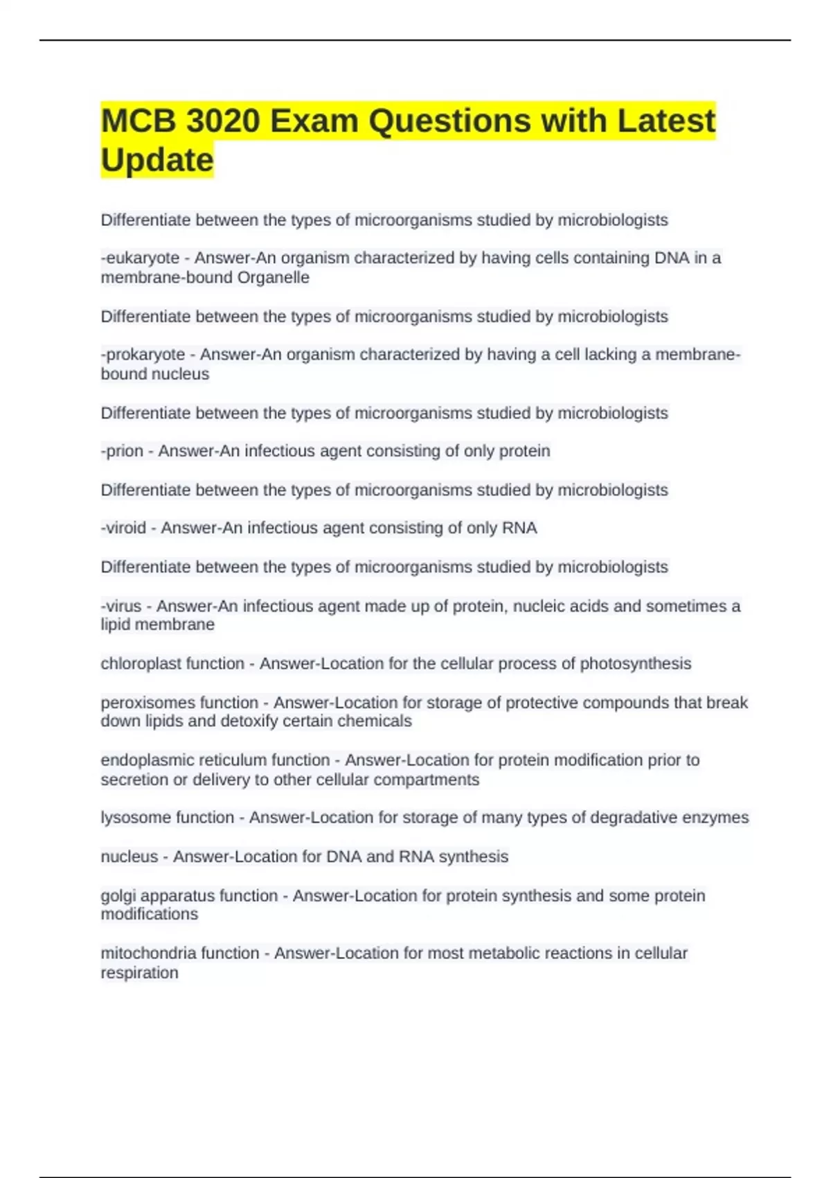 MCB 3020 Exam Questions with Latest