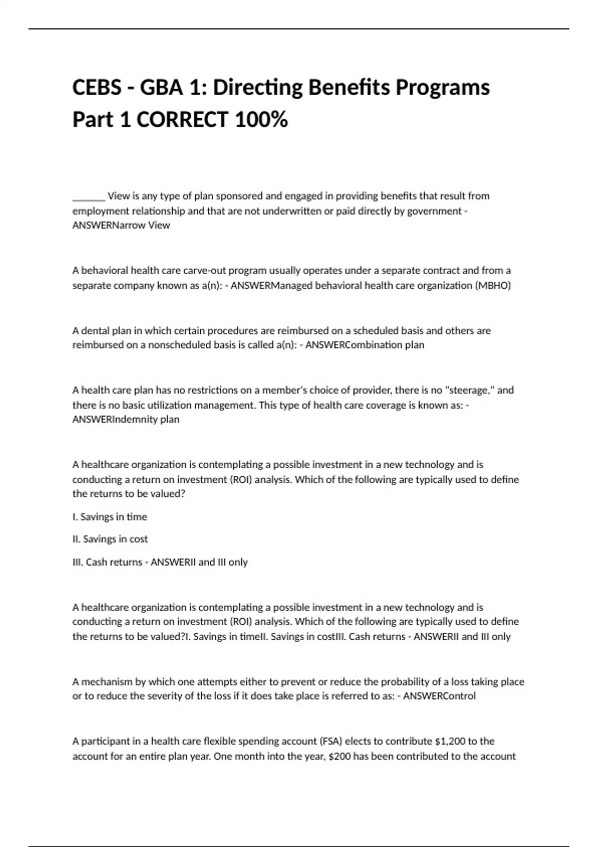 CEBS - GBA 1: Directing Benefits Programs Part 1 CORRECT 100%