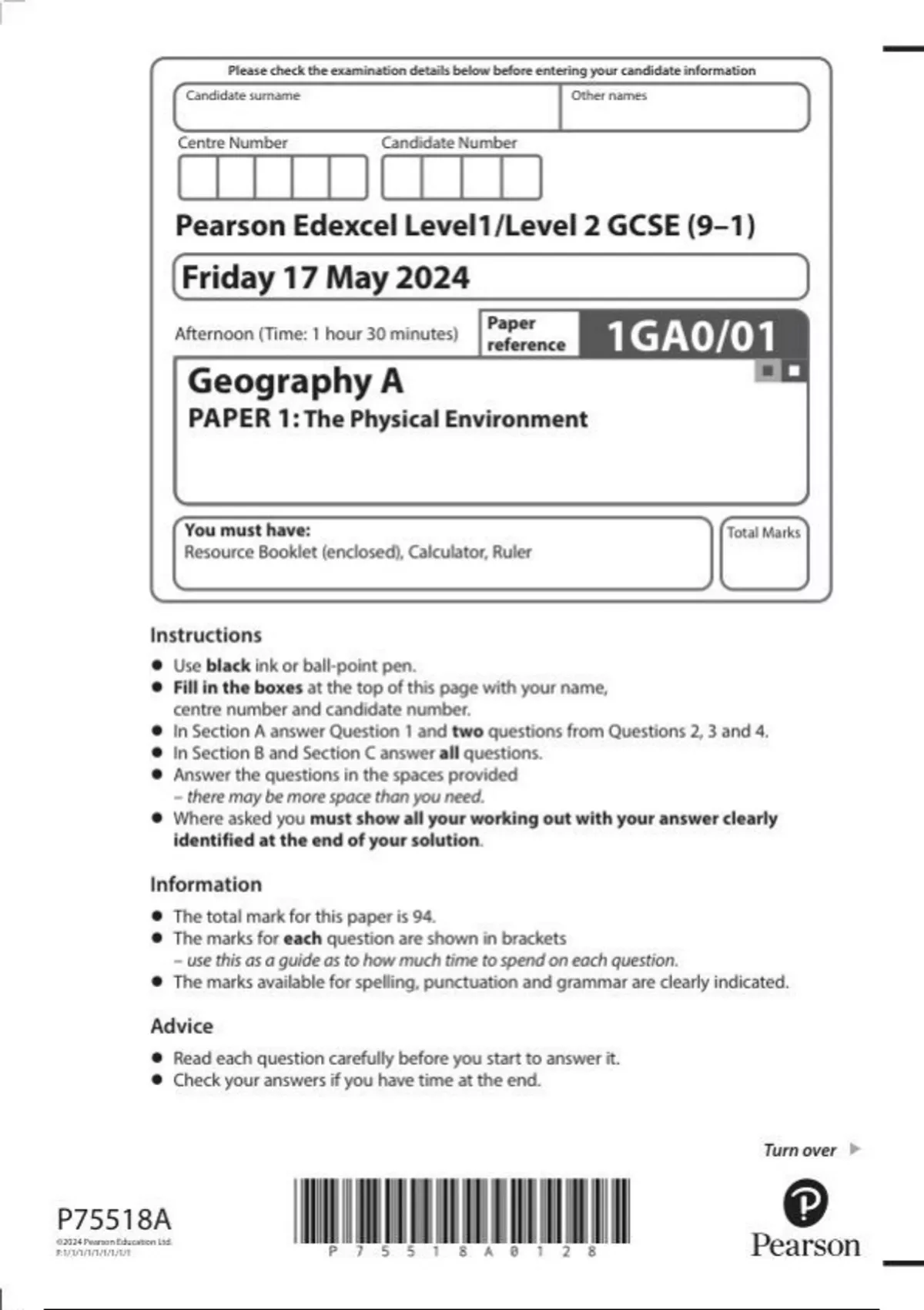 Pearson Edexcel Level1/Level 2 GCSE (9–1) Geography A Paper 1GA0/01 PAPER 1 The Physical Environment June 2024