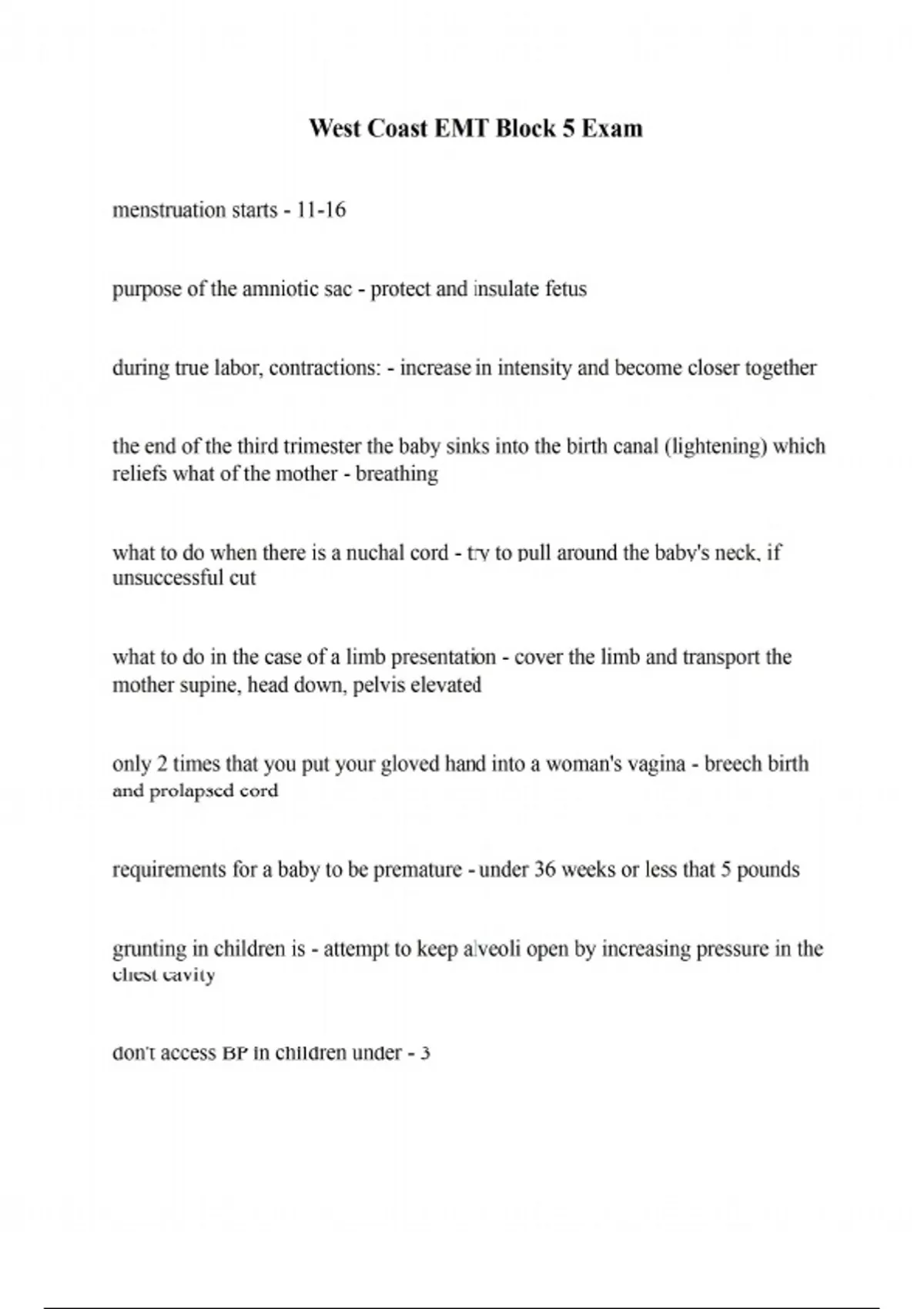 menstruation starts - 11-16 purpose of the amniotic sac - protect and insulate fetus during true labor, contractions: - increase in intensity and become closer together the end of the third trimester the baby sinks into the birth canal (lightening) which reliefs what of the mother - breathing what to do when there is a nuchal cord - try to pull around the baby's neck, if unsuccessful cut what to do in the case of a limb presentation - cover the limb and transport the mother supine, head down, pelvis elevated only 2 times that you put your gloved hand into a woman's vagina - breech birth and prolapsed cord requirements for a baby to be premature - under 36 weeks or less that 5 pounds grunting in children is - attempt to keep alveoli open by increasing pressure in the chest cavity don't access BP in children under - 3 PAT - allows you to forms a general impression of the child quickly and visually NPAs are rarely used in - infants under 1 what happens in an NPA is too long - stimulate the vagus nerve, slows HR, enters esophagus and causes gastric distention most common S&S of head injury in children - nausea and vomiting the umbilical cord has - 2 arteries and 1 vein priority after child is born - airway, then keep warm and dry respiratory rate of infant 1 month to 1 year - 30 to 60 respiratory rate of toddler 1 to 3 years - 24 to 40 respiratory rate of preschool 4 to 5 years - 22 to 34 respiratory rate of school 6 to 12 years - 18 to 30 respiratory rate of adolescent 13 to 18 years - 12 to 16 pulse rate of newborn to 3 months - 85 to 205 pulse rate of 3 months to 2 years - 100 to 190 pulse rate of 2 years to 10 years - 60 to 140 pulse rate of over 10 year olds - 60 to 100 A 26-year-old female presents with heavy vaginal bleeding. She is conscious, but restless. Her blood pressure is 84/54 mm Hg, her pulse is 120 beats/min and weak, and her respirations are 22 breaths/min with adequate depth. She tells you that she inserted a tampon about 2 hours ago. You should: A. administer high-flow oxygen, ask her to remove the tampon, perform a detailed secondary assessment, and transport promptly. B. administer high-flow oxygen, place a sterile pad over her vagina, keep her warm, elevate her lower extremities, and transport without delay. C. administer high-flow oxygen, perform a detailed assessment of her vaginal area for signs of trauma, place her on her side, and transport. D. assist her ventilations with a bag-valve mask, place one sterile dressing into her vagina, perform a rapid secondary assessment, and transport. - B. administer highflow oxygen, place a sterile pad over her vagina, keep her warm, elevate her lower extremities, and transport without delay A patient with pelvic inflammatory disease will typically complain of _________. A. bleeding associated with stress B. abdominal pain associated with menstruation C. aches and fever associated with urination D. nausea and vomiting associated with intercourse - B. abdominal pain associated with menstruation Causes of vaginal bleeding include which of the following? A. Ectopic pregnancy B. Vaginal trauma C. Spontaneous abortion D. All of these answers are correct. - D. All of these answers are correct. During gynecologic emergencies, in addition to the standard SAMPLE questions, the EMT should attempt to determine which of the following? Select one: A. The amount of time since of the patent's last menstrual cycle B. The possibility that the patient may be pregnant C. If the patient is sexually active D. All of these answers are correct. - D. All of these answers are correct. In anticipation of receiving a fertilized ovum, the lining of the uterine wall: Select one: A. sheds and is expelled externally. B. thins and begins to separate. C. becomes engorged with blood. D. diverts blood flow to the vagina. - C. becomes engorged with blood. In cases of sexual assault, it is important to ensure that you do which of the following? Select one: A. Immediately write down your observations of the scene before assessing the patient. B. Call for a female EMT or ALS care provider. C. Discuss with law enforcement any suspicions that you may have about the perpetrator. D. All of these answers are correct. - D. All of these answers are correct. In contrast to bleeding caused by external trauma to the vagina, bleeding caused by conditions such as polyps or cancer: Select one: A. is typically not as severe. B. often presents with acute pain. C. can be controlled in the field. D. may be relatively painless. - D. may be relatively painless. It is common for young females who experience their first menstrual period to: Select one: A. become so emotionally distraught that they contemplate suicide. B. have a false positive home pregnancy test result. C. lose up to 500 mL of blood within the first 24 hours. D. experience abdominal cramping, which may be misinterpreted. - D. experience abdominal cramping, which may be misinterpreted. Law enforcement personnel request your assistance to assess a 31-year-old female who was sexually assaulted. When you arrive at the scene, you find the patient sitting on a curb outside her apartment. She is conscious, alert, and crying. When you ask her what happened, she tells you that she does not want to be treated or transported to the hospital. She further tells you that all she wants to do is clean up. You should: Select one: A. provide emotional support and visually assess her for obvious trauma. B. advise her that she cannot clean herself up because this will destroy evidence. C. perform a limited hands-on assessment to detect life-threatening injuries. D. ask her if there is anyone you can contact, such as a friend or relative. - A. provide emotional support and visually assess her for obvious trauma. Patient complaints of pain during intercourse, lower abdominal discomfort, and nausea may be indicative of which of the following? Select one: A. Chlamydia B. Gonorrhea C. Pelvic inflammatory disease D. Bacterial vaginosis - C. Pelvi