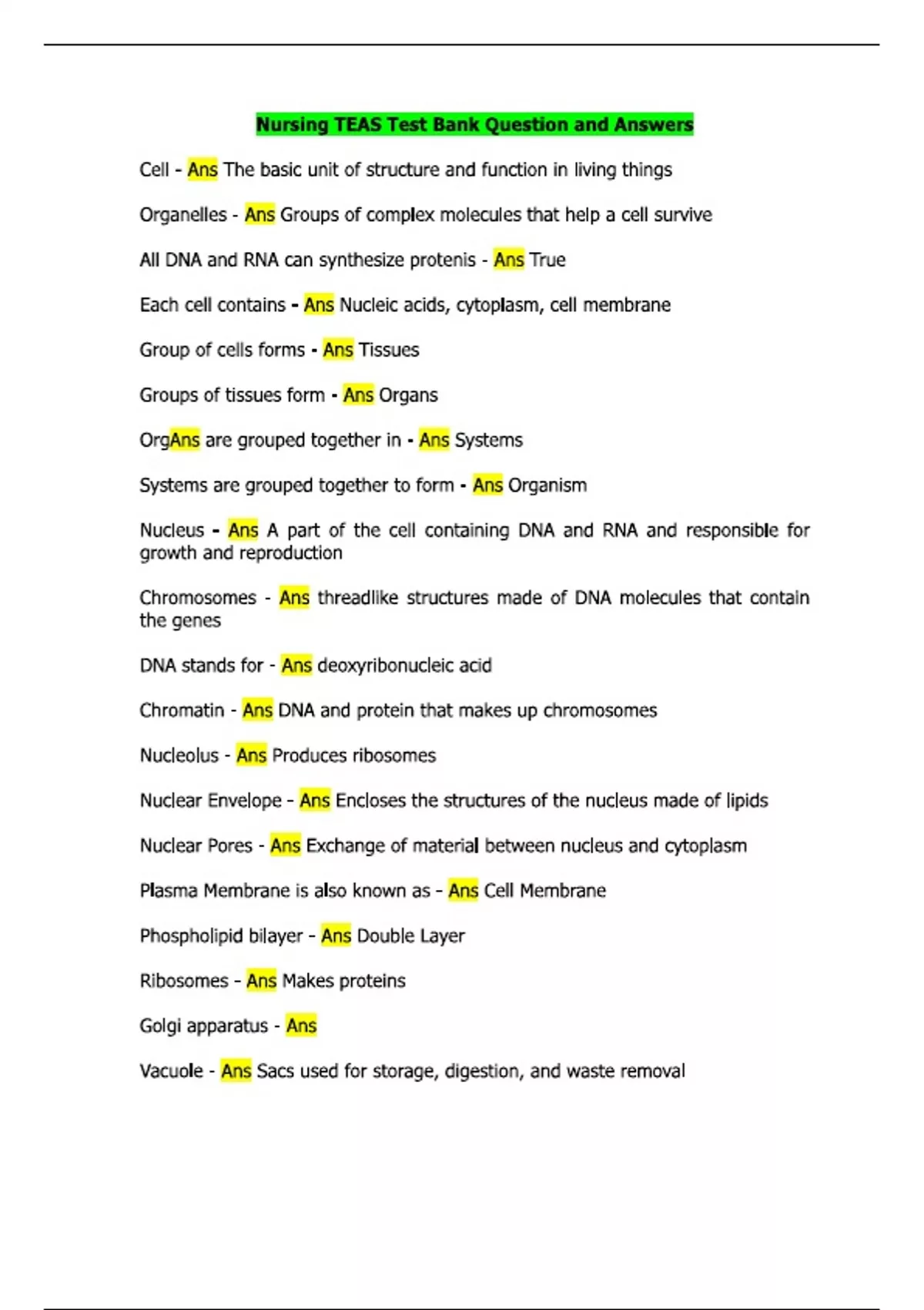 Nursing TEAS Test Bank Question and Answers Cell - Ans The basic unit of structure and function in living things Organelles - Ans Groups of complex molecules that help a cell survive All DNA and RNA can synthesize protenis - Ans True Each cell contains - Ans Nucleic acids, cytoplasm, cell membrane Group of cells forms - Ans Tissues Groups of tissues form - Ans Organs OrgAns are grouped together in - Ans Systems Systems are grouped together to form - Ans Organism Nucleus - Ans A part of the cell containing DNA and RNA and responsible for growth and reproduction Chromosomes - Ans threadlike structures made of DNA molecules that contain the genes DNA stands for - Ans deoxyribonucleic acid Chromatin - Ans DNA and protein that makes up chromosomes Nucleolus - Ans Produces ribosomes Nuclear Envelope - Ans Encloses the structures of the nucleus made of lipids Nuclear Pores - Ans Exchange of material between nucleus and cytoplasm Plasma Membrane is also known as - Ans Cell Membrane Phospholipid bilayer - Ans Double Layer Ribosomes - Ans Makes proteins Golgi apparatus - Ans Vacuole - Ans Sacs used for storage, digestion, and waste removal