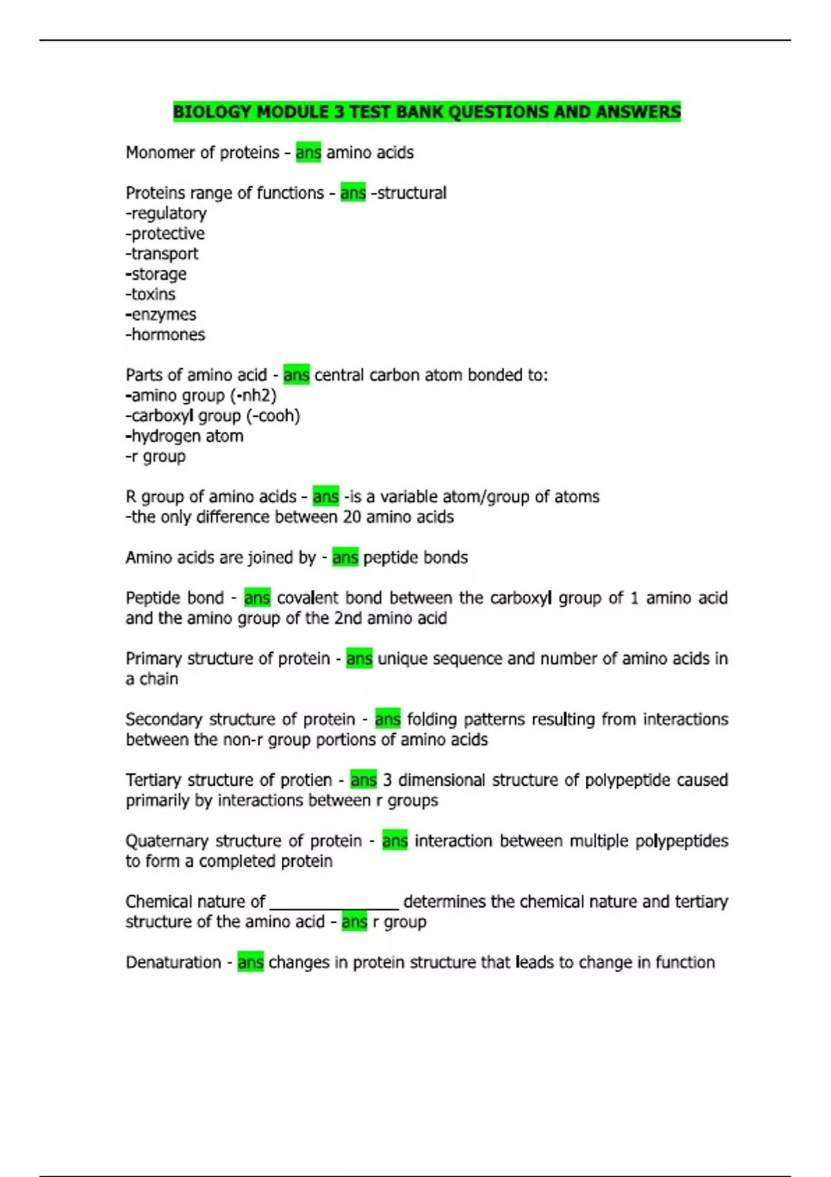 BIOLOGY MODULE 3 TEST BANK QUESTIONS AND ANSWERS Monomer of proteins - ans amino acids Proteins range of functions - ans -structural -regulatory -protective -transport -storage -toxins -enzymes -hormones Parts of amino acid - ans central carbon atom bonded to: -amino group (-nh2) -carboxyl group (-cooh) -hydrogen atom -r group R group of amino acids - ans -is a variable atom/group of atoms -the only difference between 20 amino acids Amino acids are joined by - ans peptide bonds Peptide bond - ans covalent bond between the carboxyl group of 1 amino acid and the amino group of the 2nd amino acid Primary structure of protein - ans unique sequence and number of amino acids in a chain Secondary structure of protein - ans folding patterns resulting from interactions between the non-r group portions of amino acids Tertiary structure of protien - ans 3 dimensional structure of polypeptide caused primarily by interactions between r groups Quaternary structure of protein - ans interaction between multiple polypeptides to form a completed protein Chemical nature of ______________ determines the chemical nature and tertiary structure of the amino acid - ans r group Denaturation - ans changes in protein structure that leads to change in function What causes denaturation? - ans ph, temperature, chemicals Thermodynamics - ans the study of energy and energy transfer involving physical matter Energy -